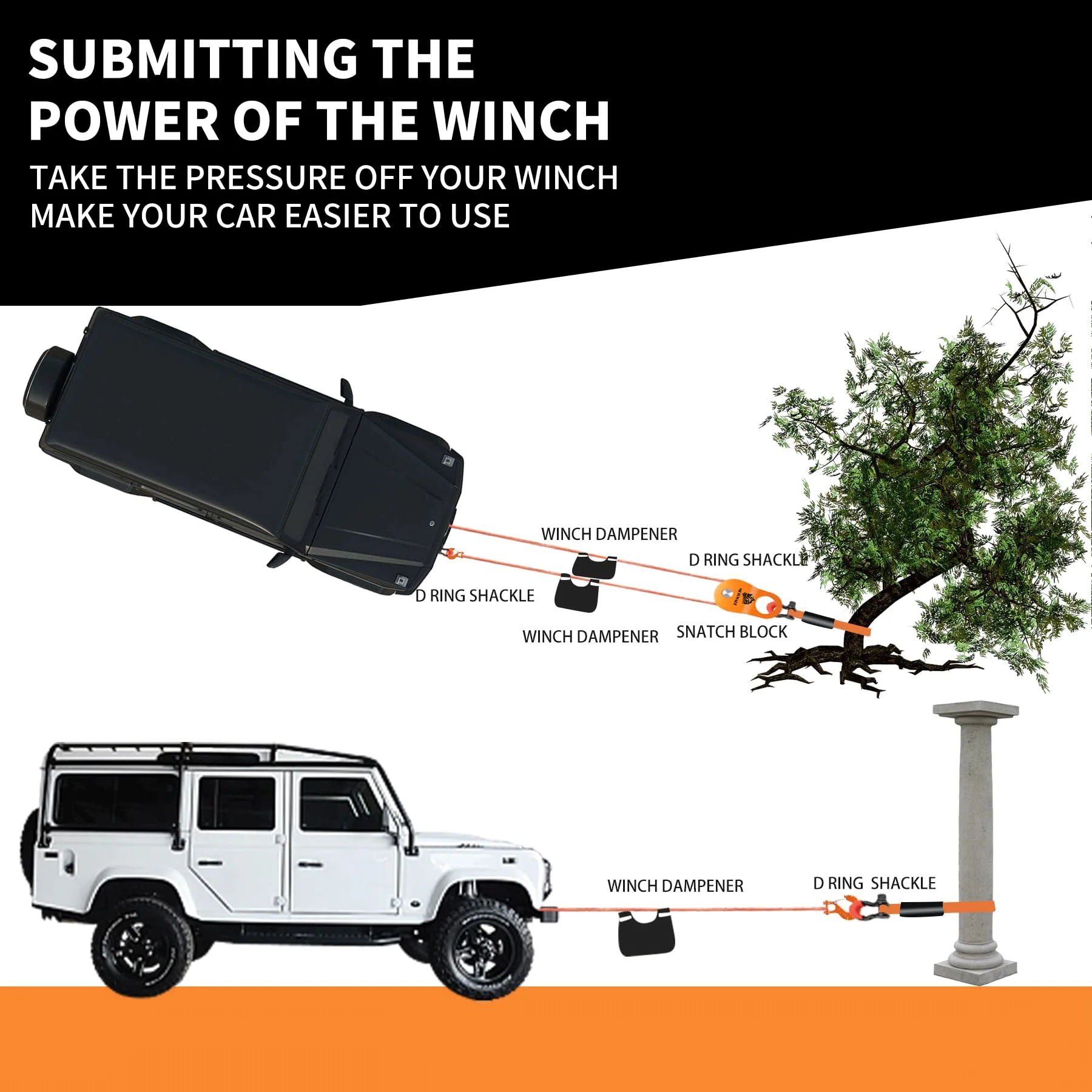 - WINCH LINE DAMPENER: The 2-in-1 design allows you to store and carry everything you need in this trail kit. with two large outer pockets for tree saver and tow strap and four inner pockets for shackle and snatch block . You can also use the bag as a winch rope damper.