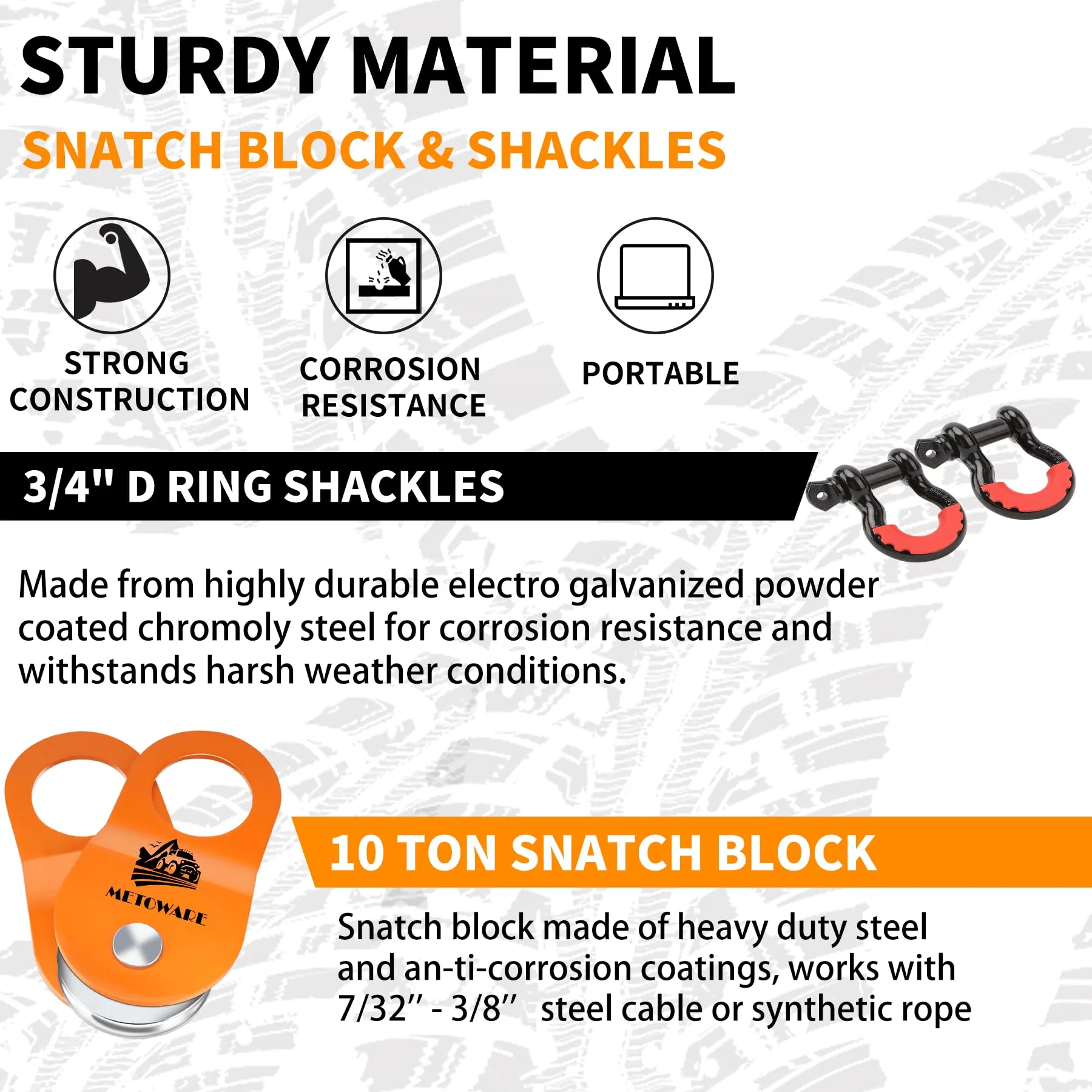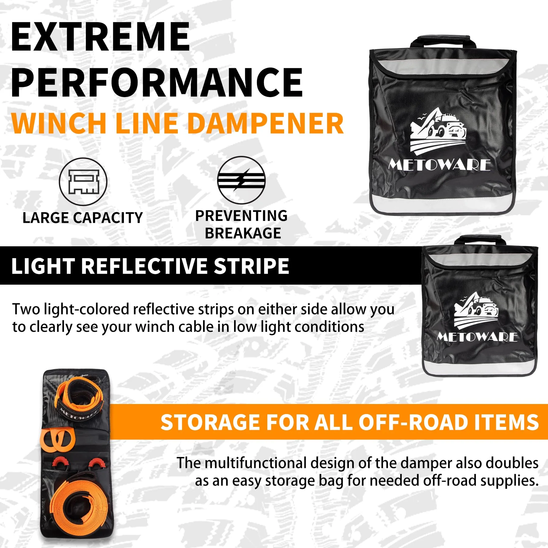 - OFF-ROAD RECOVERY KIT: METOWARE towing recovery kit includes 1pcs 3in x 8ft Tree Saver. 1pcs 3in x 20ft Tow Strap. 2pcs D Ring Shackles. 1pcs snatch block pulley. 1pcs winch line dampener bag.