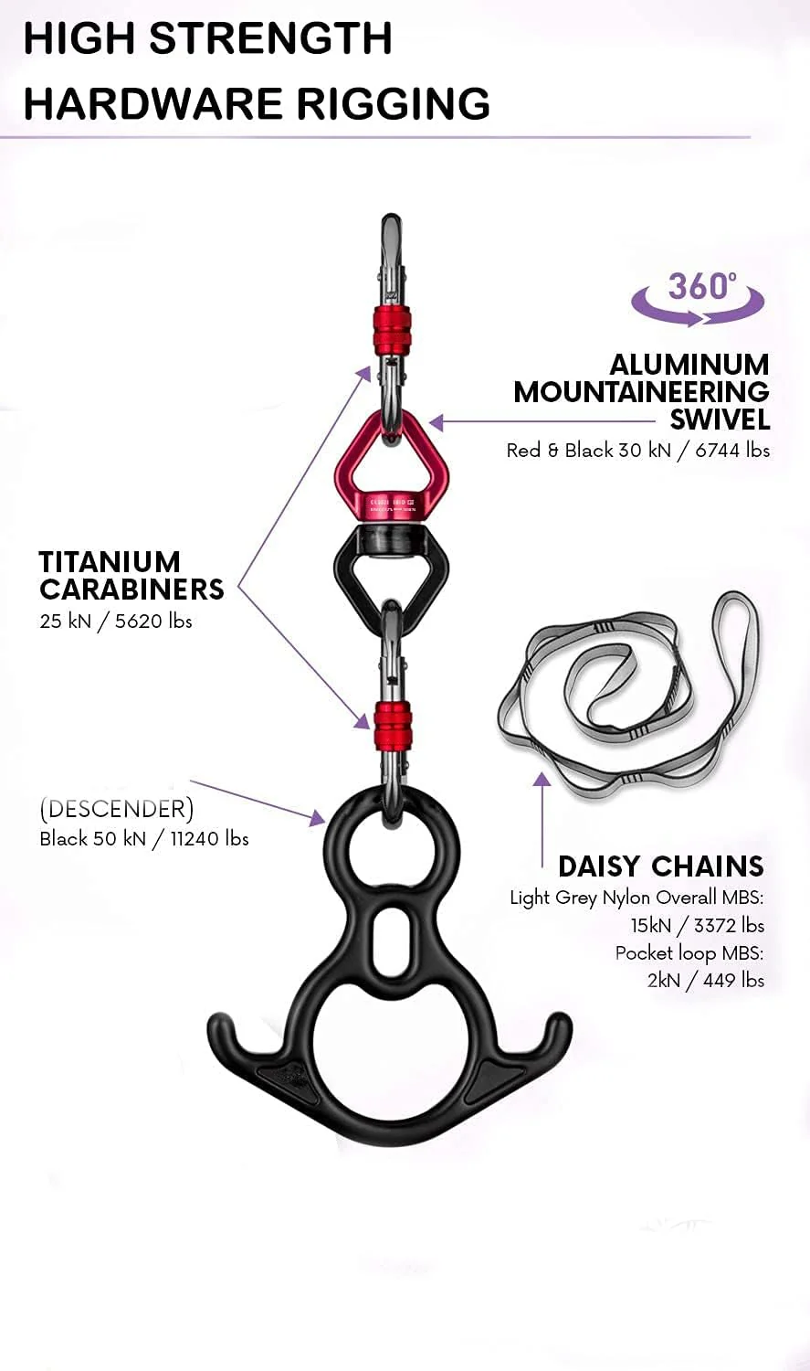 • CERTIFIED HIGH STRENGTH HARDWARE RIGGING. 2 Steel Screw-lock carabiners (5620 lbf). Rescue 8 / Descender (6744 lbf). Mountaineering Swivel (7194 lbf).