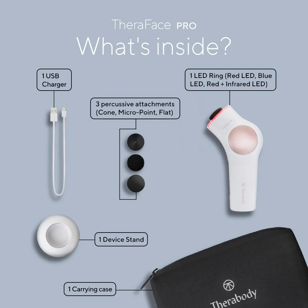 - What's Included: TheraFace device. 3 percussive attachments (Cone. Micropoint. Flat). LED Light Ring (Red. Blue & Infrared Light Therapy). Soft Carrying Bag. Stand. USB-A to USB-C charging cable