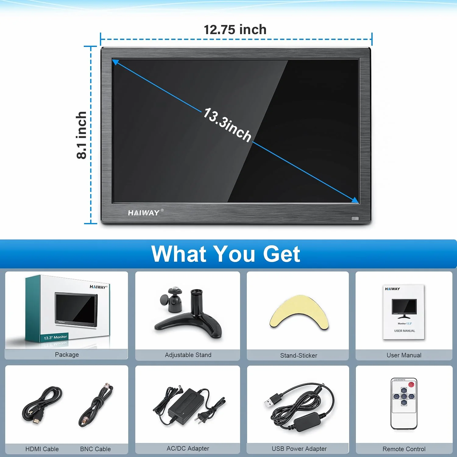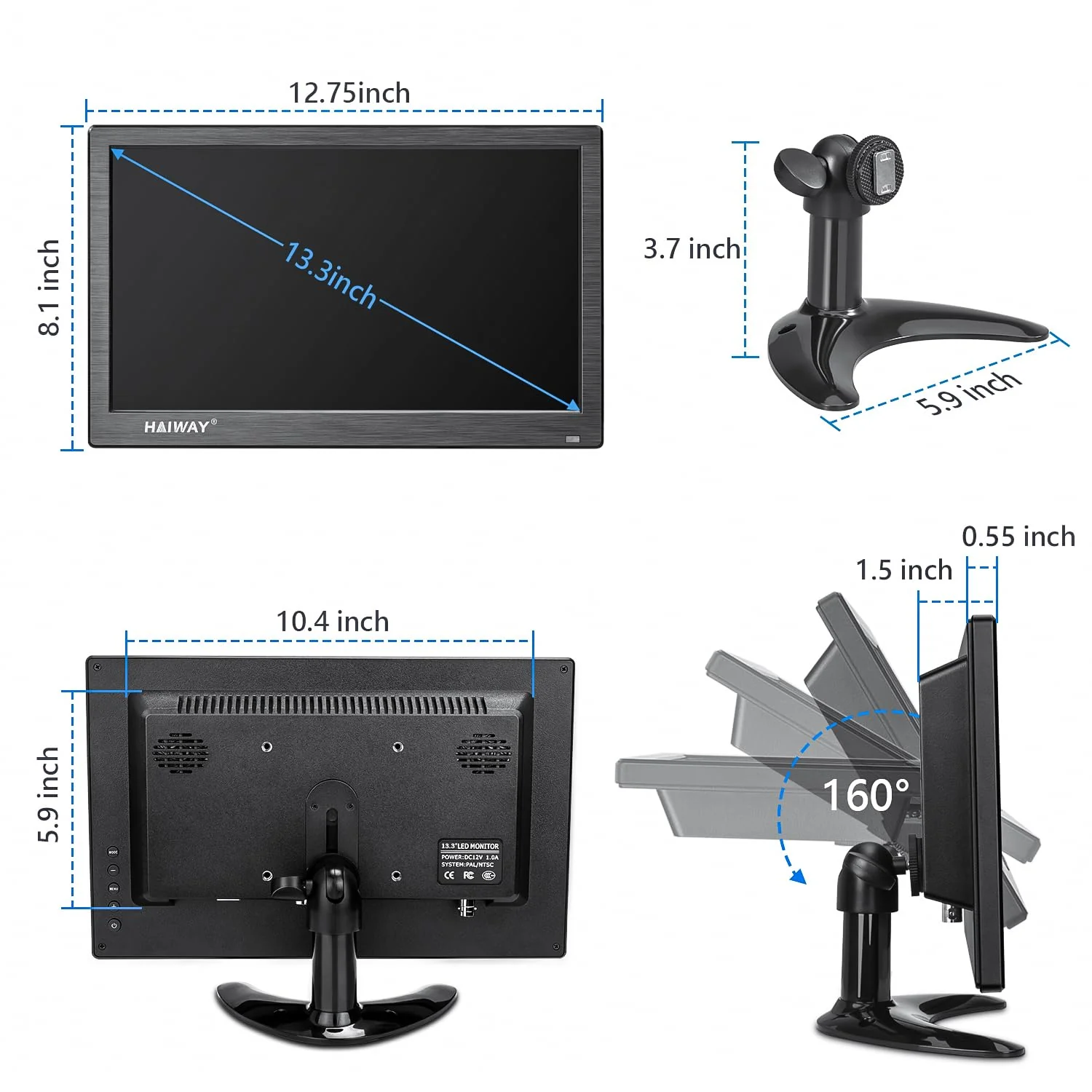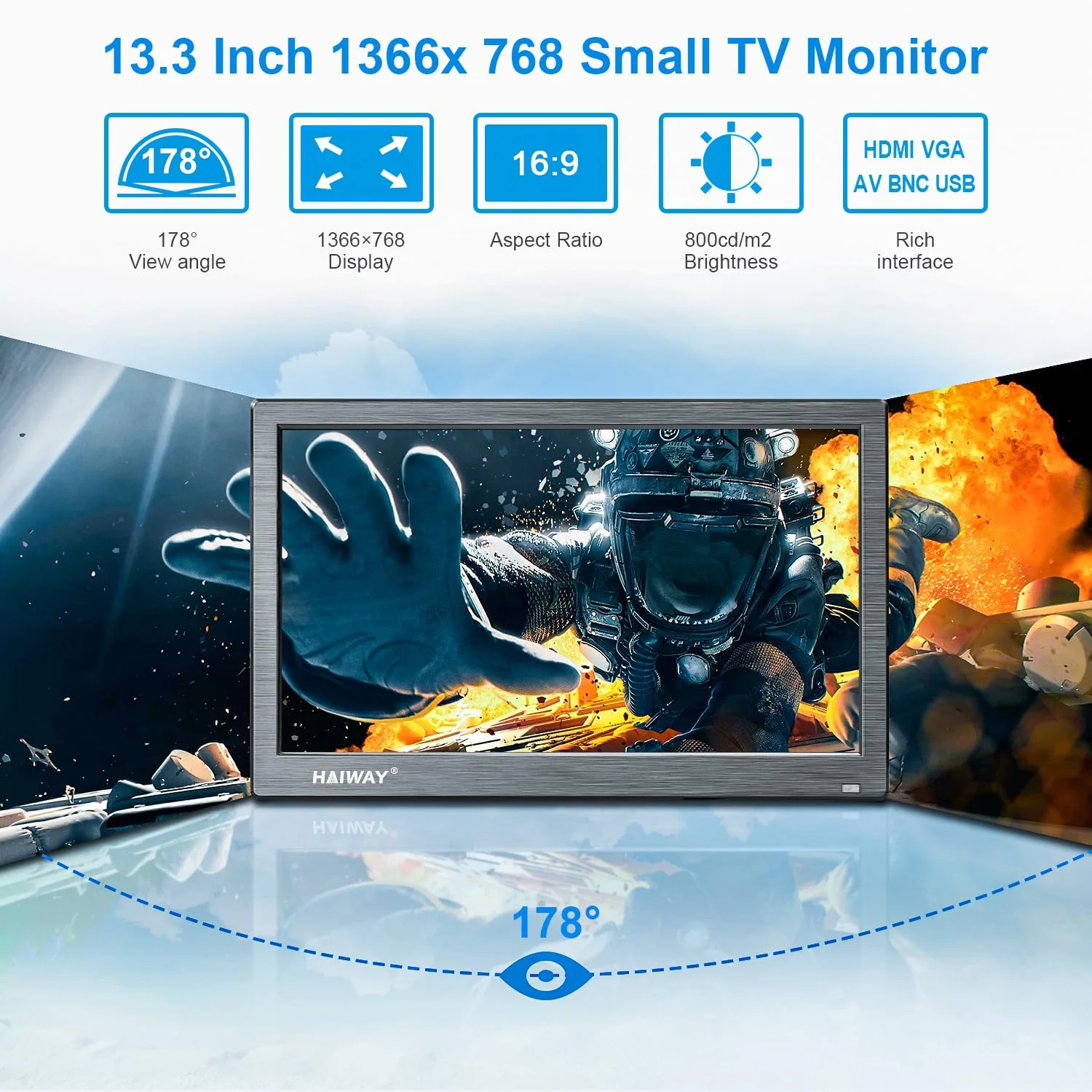 - ��Ultra HD LED Mini Monitor��: Haiway 13.3 inch monitor comes with 1366*768 resolution and 16:9 ratio. HD LED display at richer color image with a 800:1 contrast ratio makes the image quality is more delicate and realistic. 178° wide view angle demonstrate a super-exclusive imaging capability and delivers you awesome viewing experience.