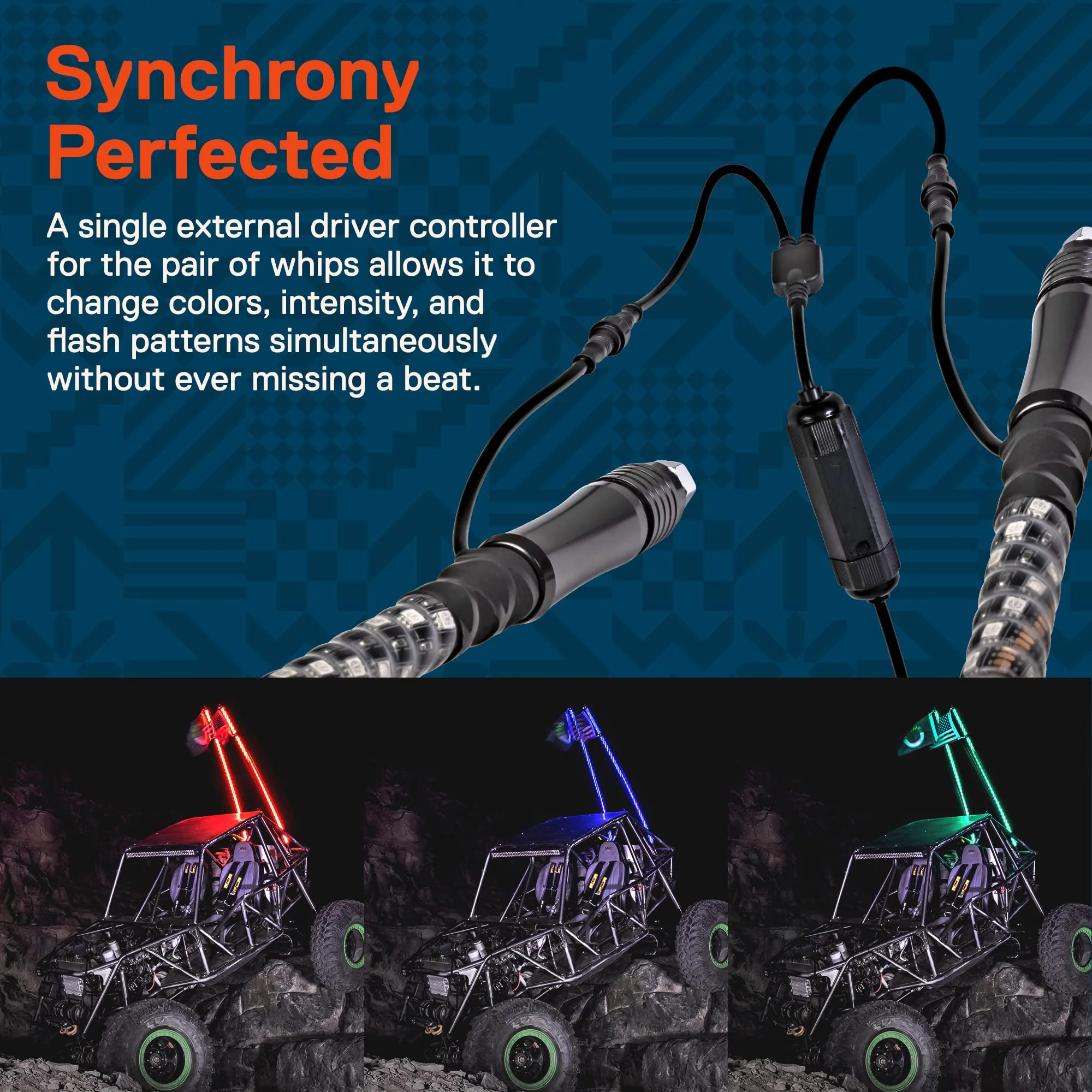 • SYNCHRONY PERFECTED - A single external driver controller for the pair of whips allows it to change colors. intensity. and flash patterns simultaneously without ever missing a beat.