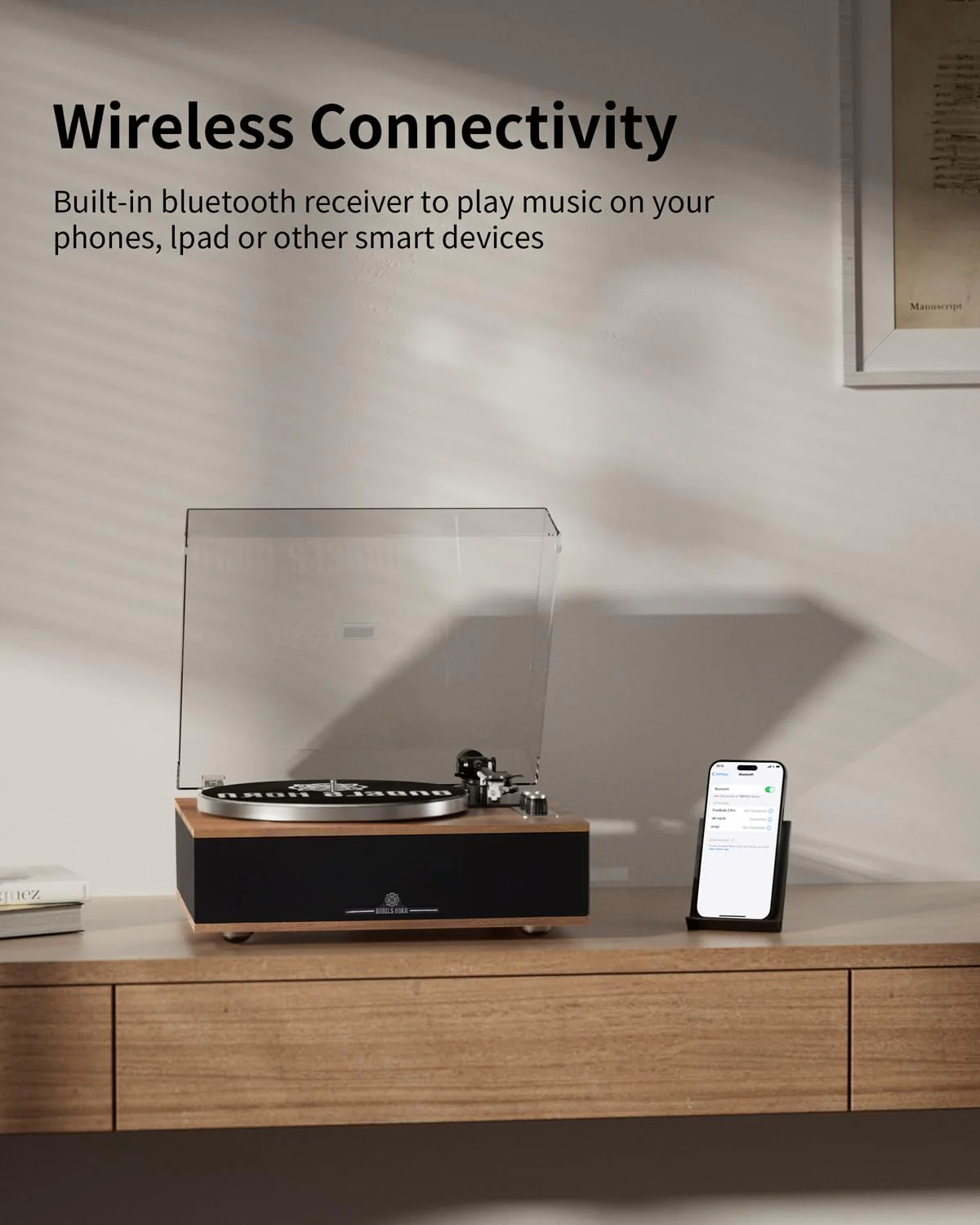 - ��Bluetooth Record Player Turntable�� Built-in Bluetooth 5.0. you can enjoy your vinyl collection with all the convenience of wireless technology. You can listen to your favorite music from your Bluetooth compatible device like mobile phones or other audio devices by this vinyl record player with speakers easily.