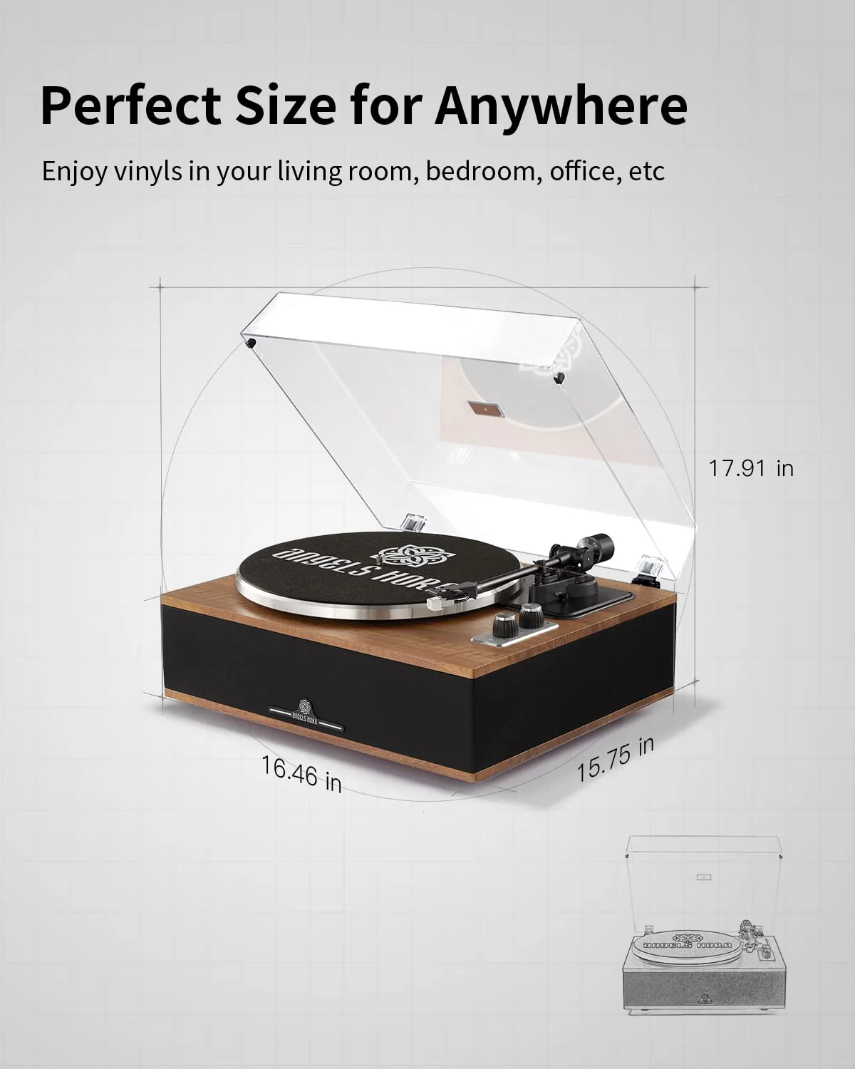 - ��All-in-One�� The vinyl record player with 4 built in speakers can make you enjoy high-fidelity sound. It also can play other devices’ music wirelessly by Bluetooth or using the Aux-in port. For better or louder sound. connect external speaker via RCA cable. Our turntable record players for vinyl with speakers includes both Phono and Line outputs that can play with or without a Phono equalizer.