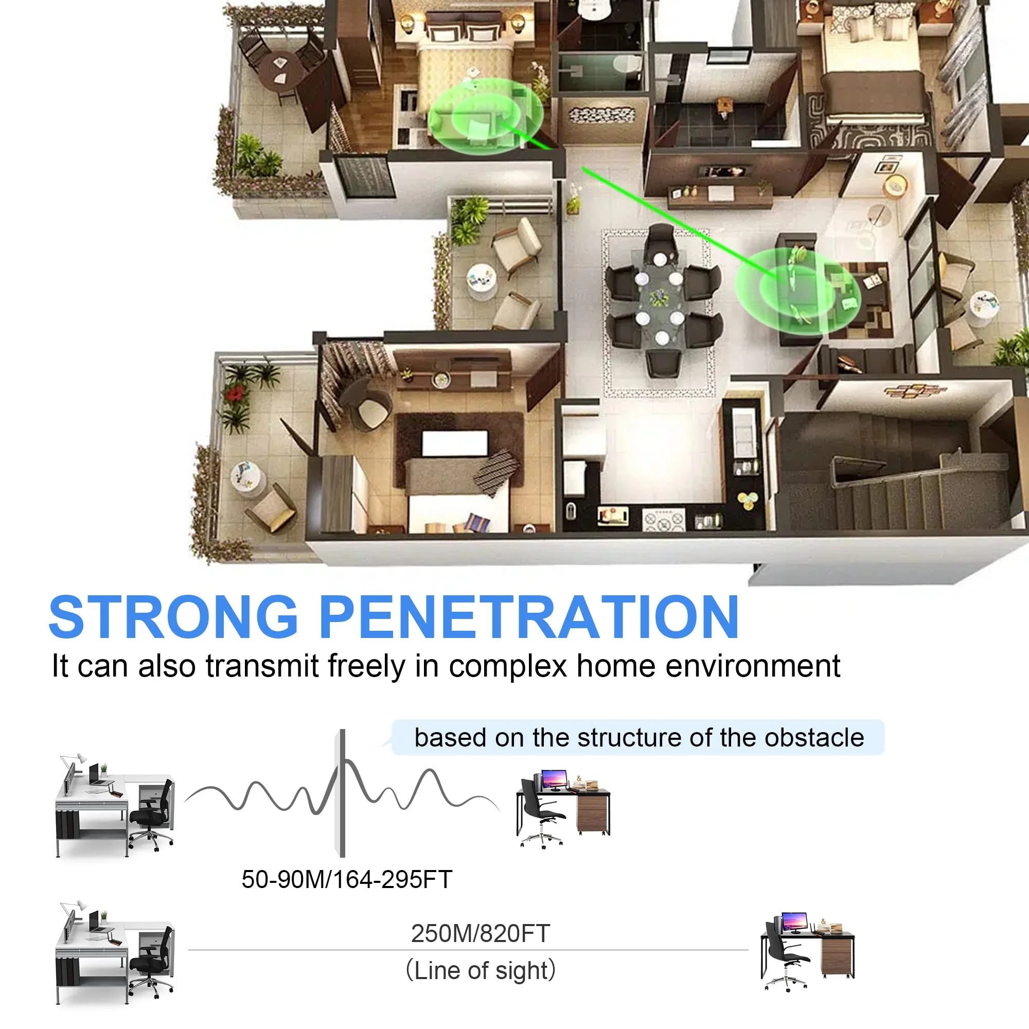 1 TX to 1 RX transmission distance: 250m;1TX to 2 RX transmission distance: 230m;