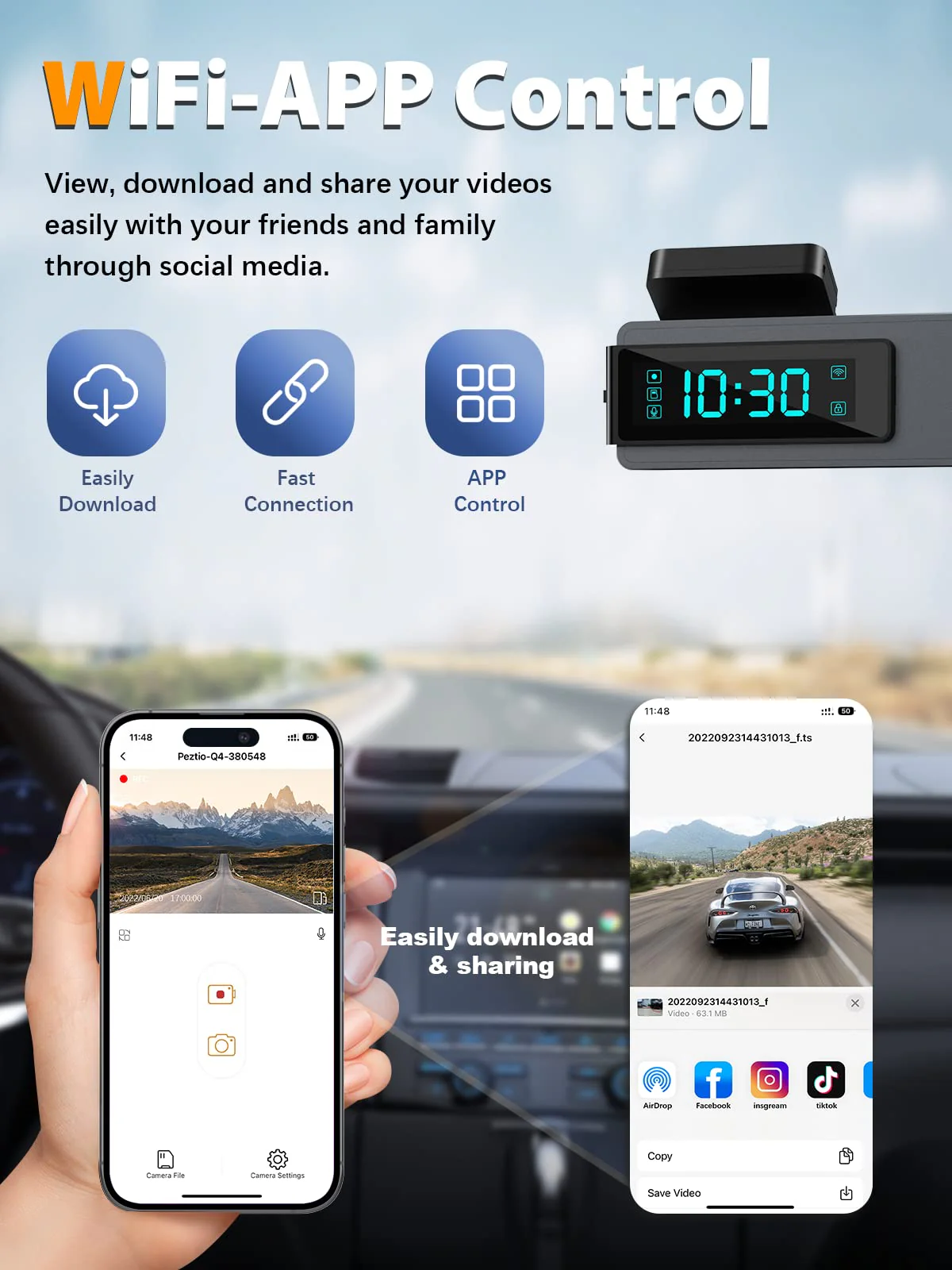 - ��Built-in 2.4G WiFi & APP Control��This delicate dashcam comes with APP for Android or iOS smartphones to get a live stream. download videos. change settings. edit and share your footage simple. Videos can be shared to YouTube. Twitter. Facebook. or the social media platform according to your preference and with the tap of a finger. allowing you to share bits and pieces of any journey with all of your friends.
