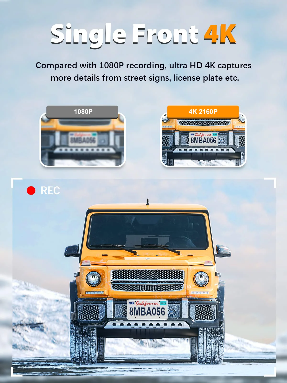 - ��4K Ultra HD 2160P Single Front Car Camera��(Rear camera unplugging required) The single front dash cam records UHD 3840*2160P/30fps video. capturing clear details of license plates and road signs day and night. With advanced GC CMOS+160° wide angle+6G lens. it vividly captures driving moments. providing detailed evidence.