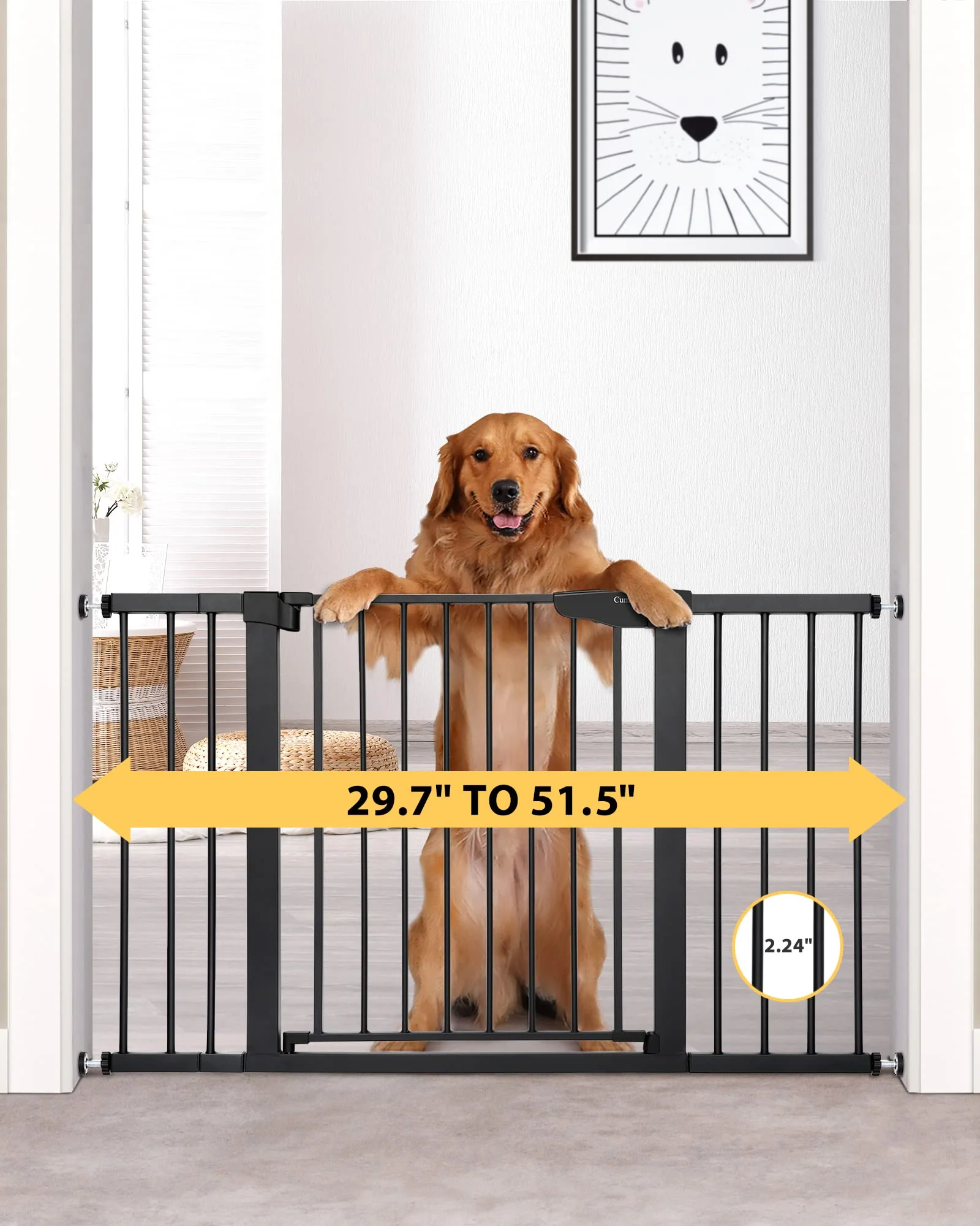 - ��No more baby gate escapes�� The Cumbor extra wide baby gate is 30.5 Inch tall and 29.7 Inch- 51.5 Inch wide. Once closed. it is hard for your kids to climb over it. Made of heavy-duty steel. it can withstand impacts and bites from large pets. Meanwhile. this dog gate can also prevent your kids and pets from squeezing through because the measurement between the bars is only 2.3 Inch.