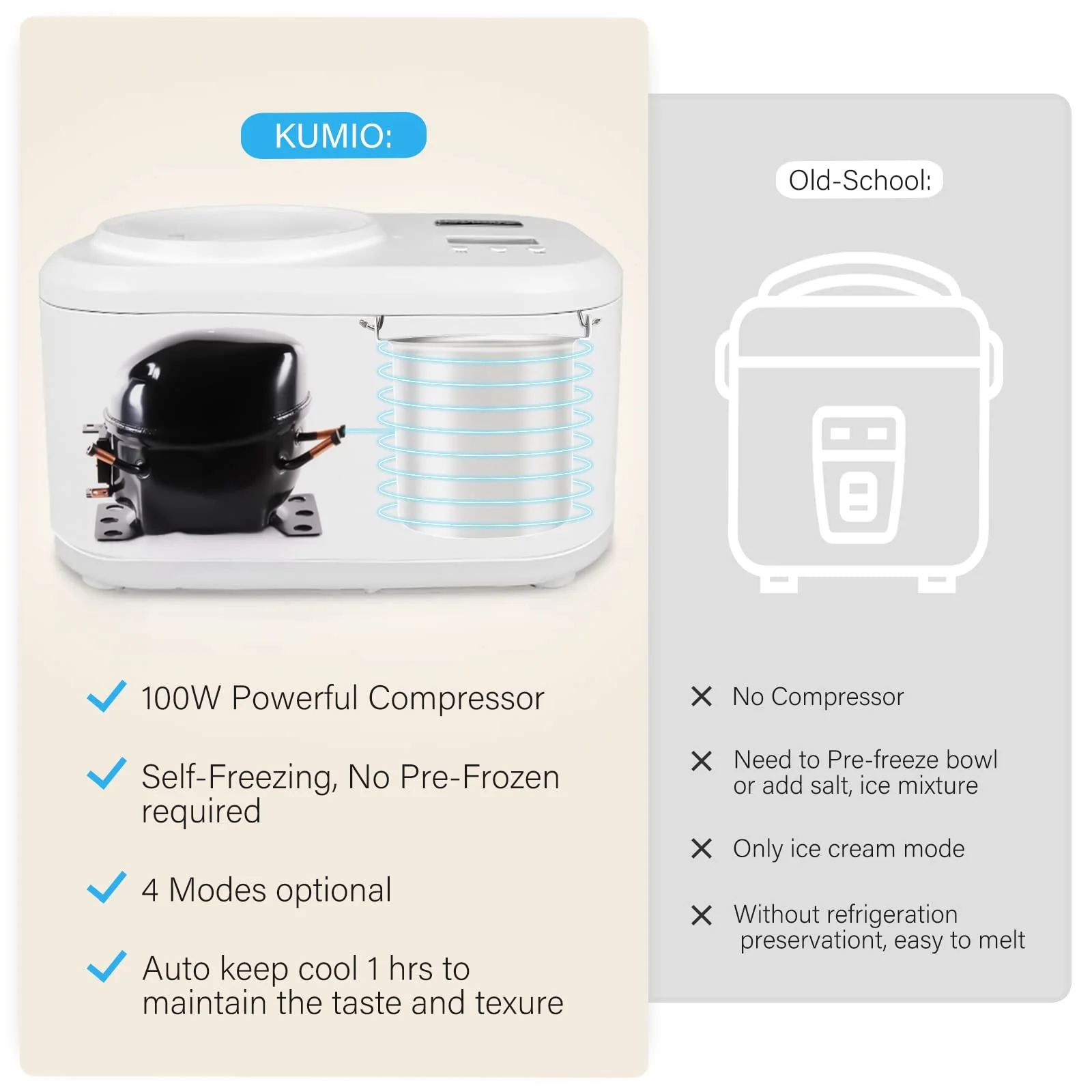 - 4 Modes & Keep Cool Function- KUMIO Ice cream maker features 4 Modes: ice cream. yogurt. single mix. single refrigeration. To maintain a chilled state and freshness. the sorbet maker will auto-keep cool 1hrs without other operation.
