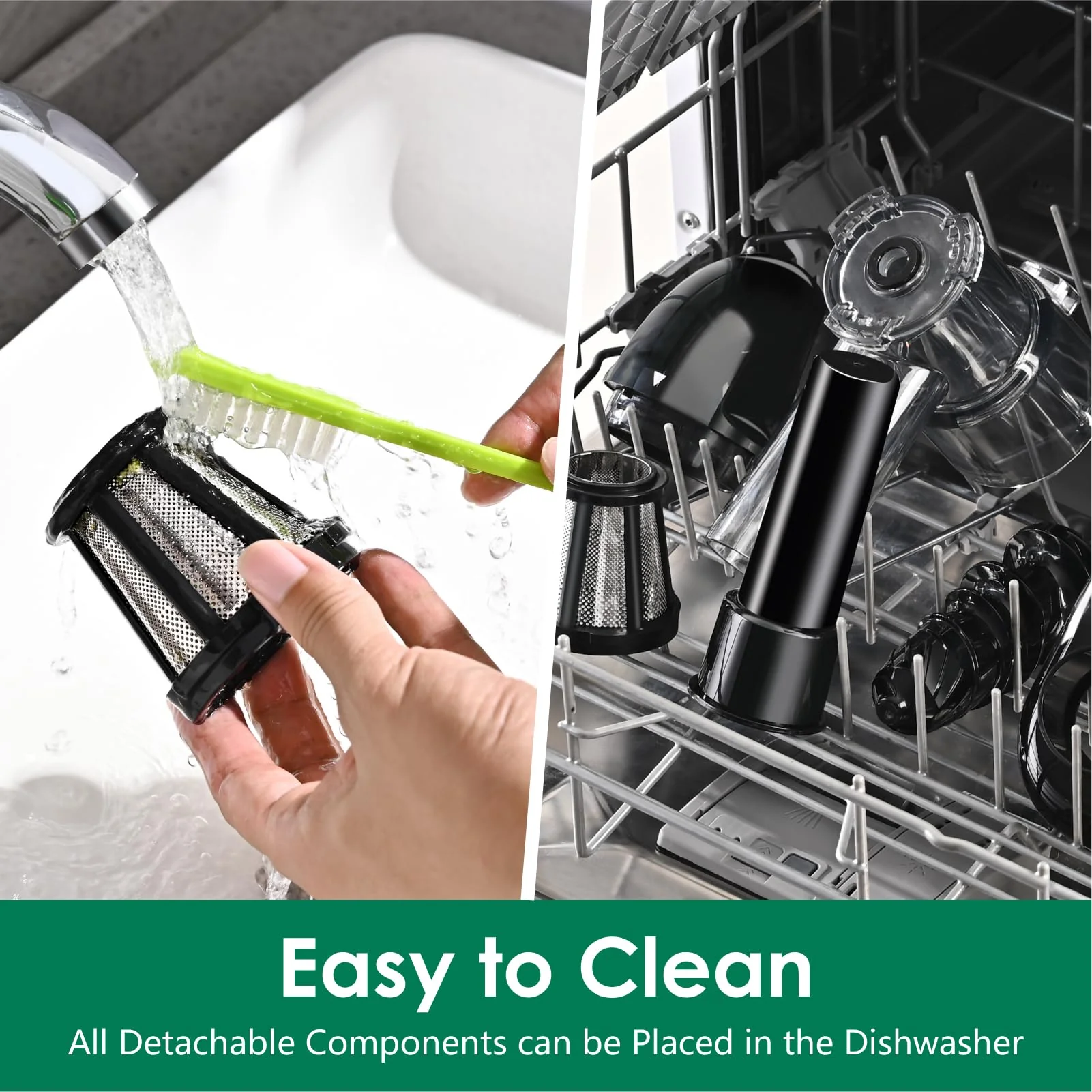 - EASY to USE & CLEAN: Easy to assemble. One-touch Disassemble. Press a button to remove the juicer body simply. We have equipped brushes for cleaning. All of the detachable parts can be sink rinsed with the brush. In addition. all detachable components can be placed in the dishwasher.