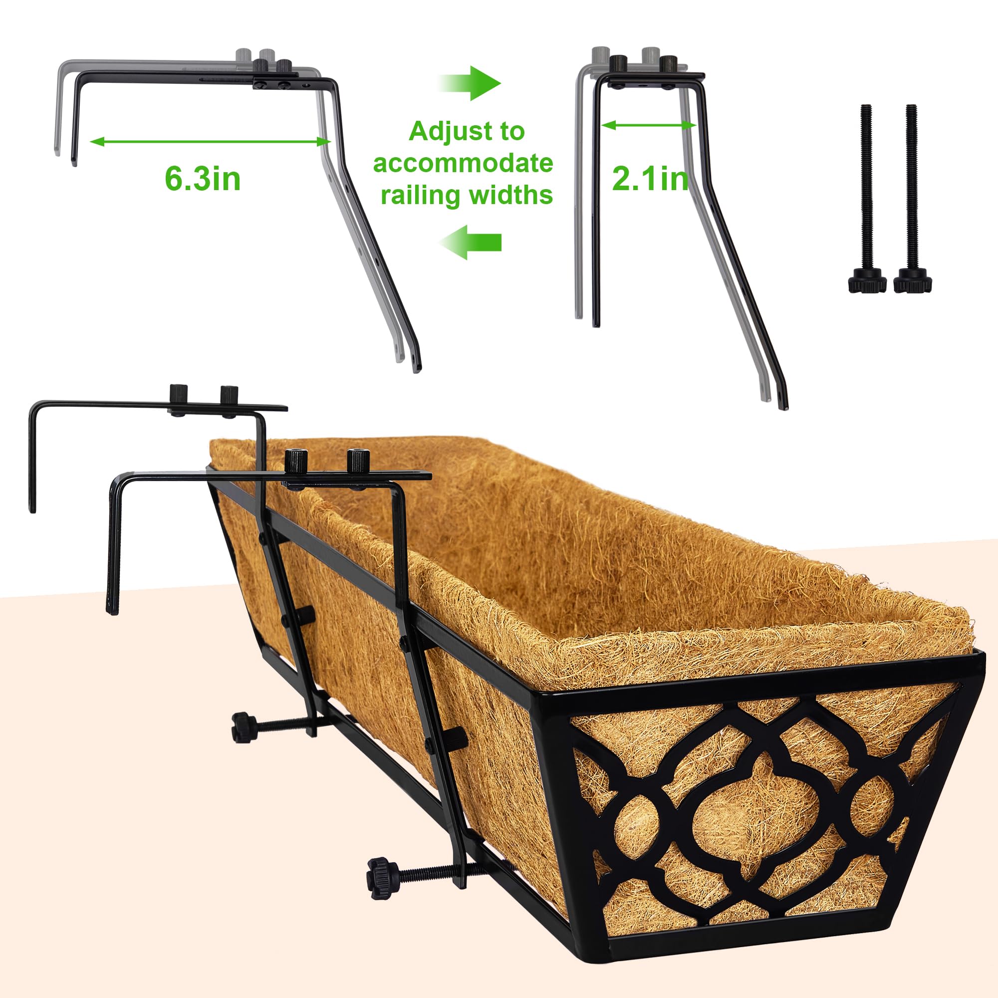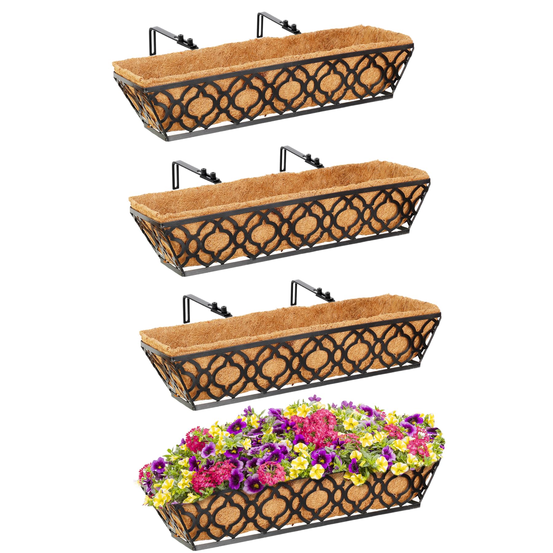 - An intricate metal frame features cut-out quatrefoil patterns in black as the included coco fiber liner provides hydration and sufficient drainage. Create a lovely floral display from a window or on a deck using this planter box.