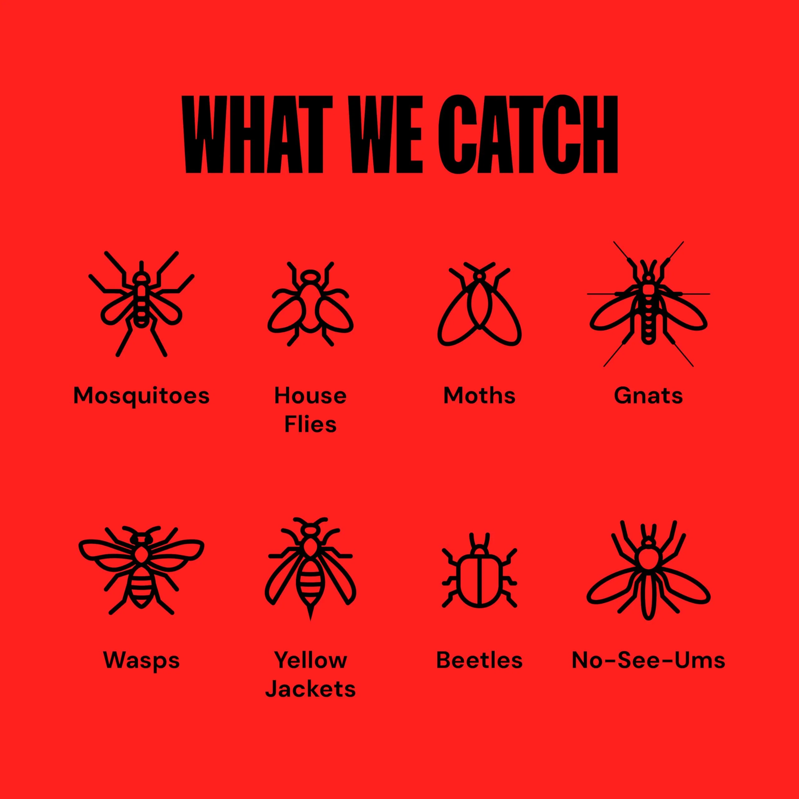 - What We Catch �C Attracts and traps mosquitoes. biting flies. house flies. moths. no-see-ums. June beetles. wasps. yellow jackets. stink bugs. gnats. and biting midges