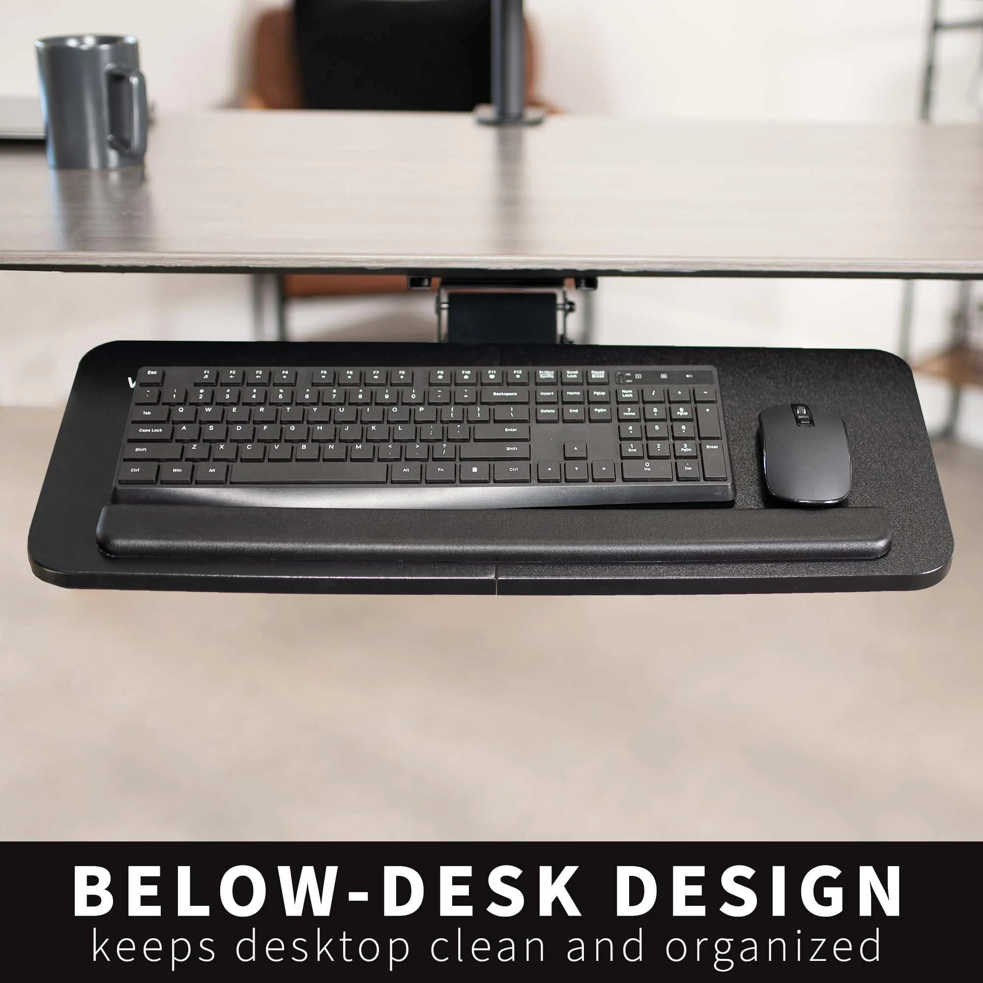 - Ergonomic Keyboard and Mouse Tray - Installs underneath a standard desk for comfortable typing angles. Please Note: If installing to a height adjustable desk. you will need a spacer bracket for the track to fit over the frame crossbar. VIVO offers adapter MOUNT-SPACER01 (not included) for this purpose. --Patent Pending--