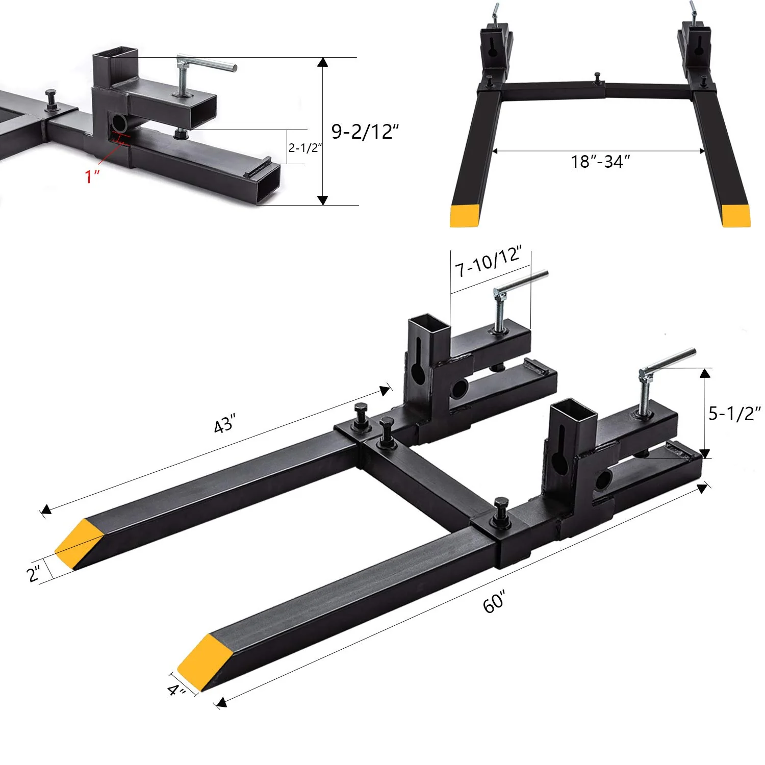 - Pallet Forks Specification:Total Length:60.Fork Length:43.Fork Width:4. Fork Height:2. Bucket lip gap: 2-1/2. Adjustable Stabilizer bar:adjusted range 18 - 34W (inside the forks).
