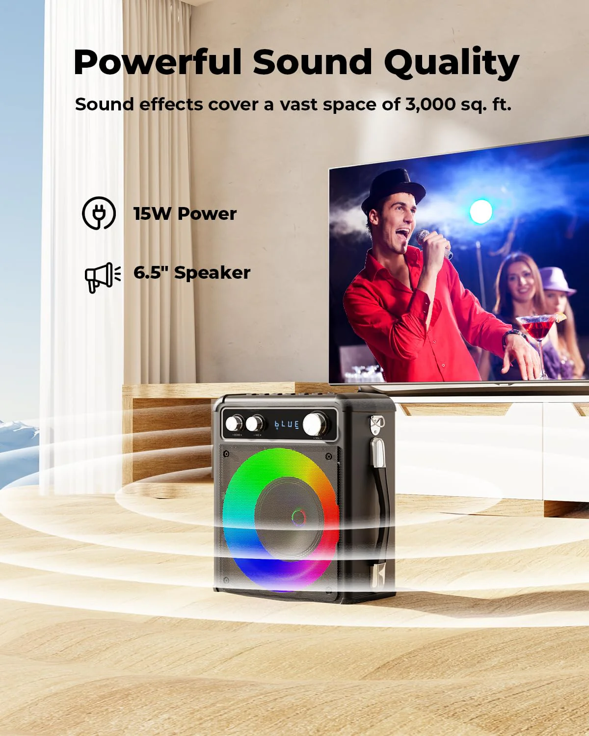 - ��Exceptional Sound Quality��Enjoy upgraded 15w PA system that amplify your voice. clear bass. comfortable midrange. and loud treble for a stunning music experience.