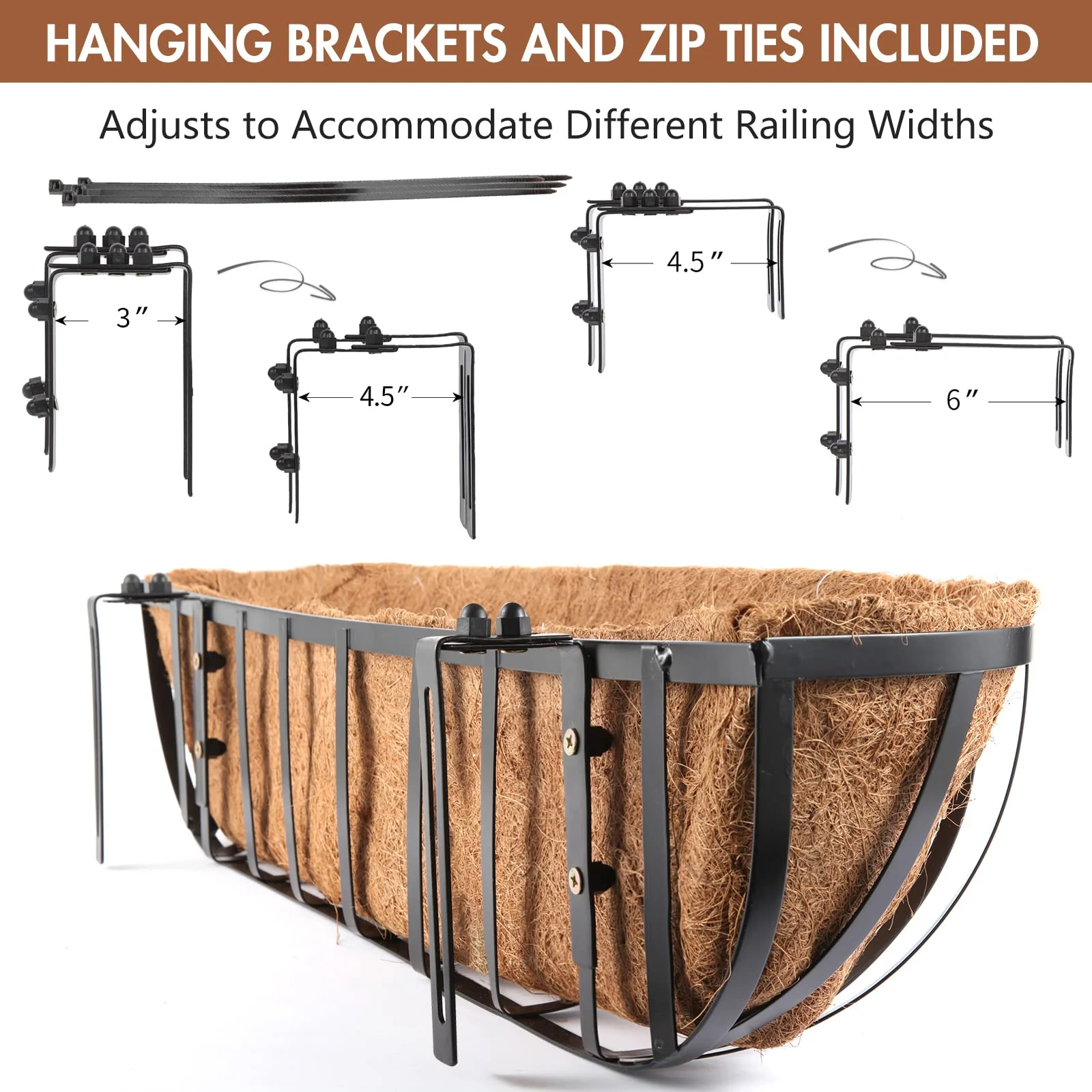 • EASY ASSEMBLY: The included hanging adjustable brackets are easy to assemble and fit any railings measuring 3 to 6 wide; pre-drilled tabs for screwing directly to the wall or window sill.
