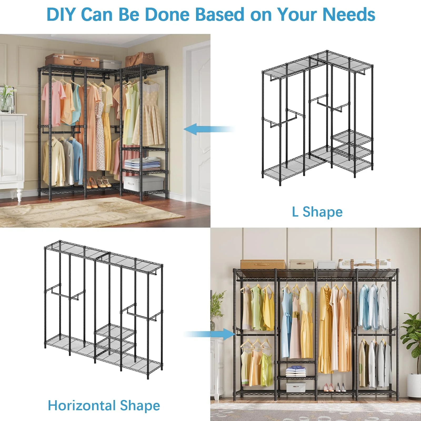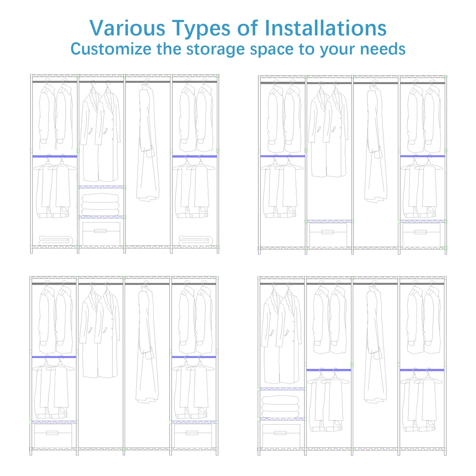 - Multi-type Installations: This clothes rack has various Installation methods to fit your different storage needs. L shape for small spaces like corner. apartment. bedroom; Straight-lined shape for walk-in closet and cloakroom clothing store.