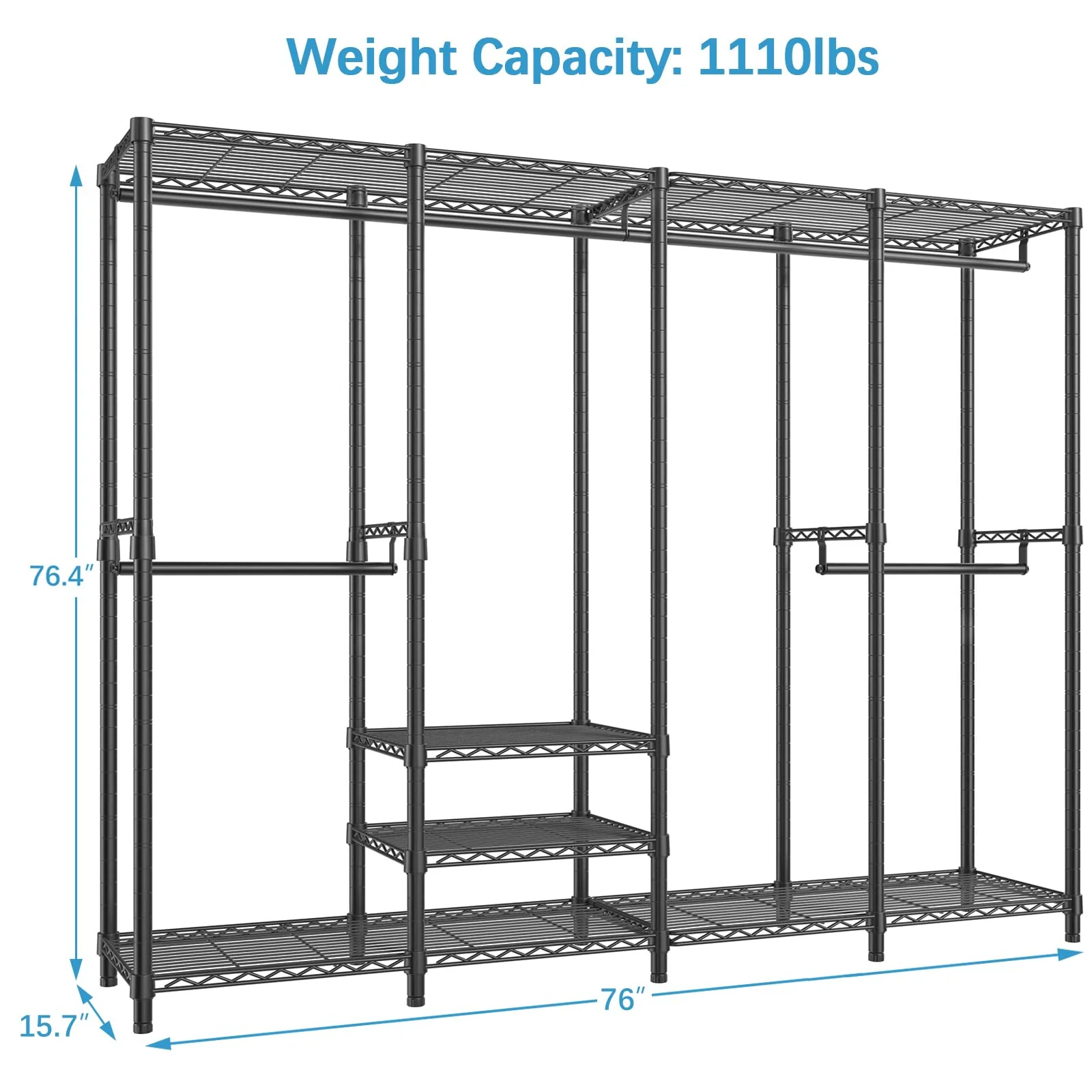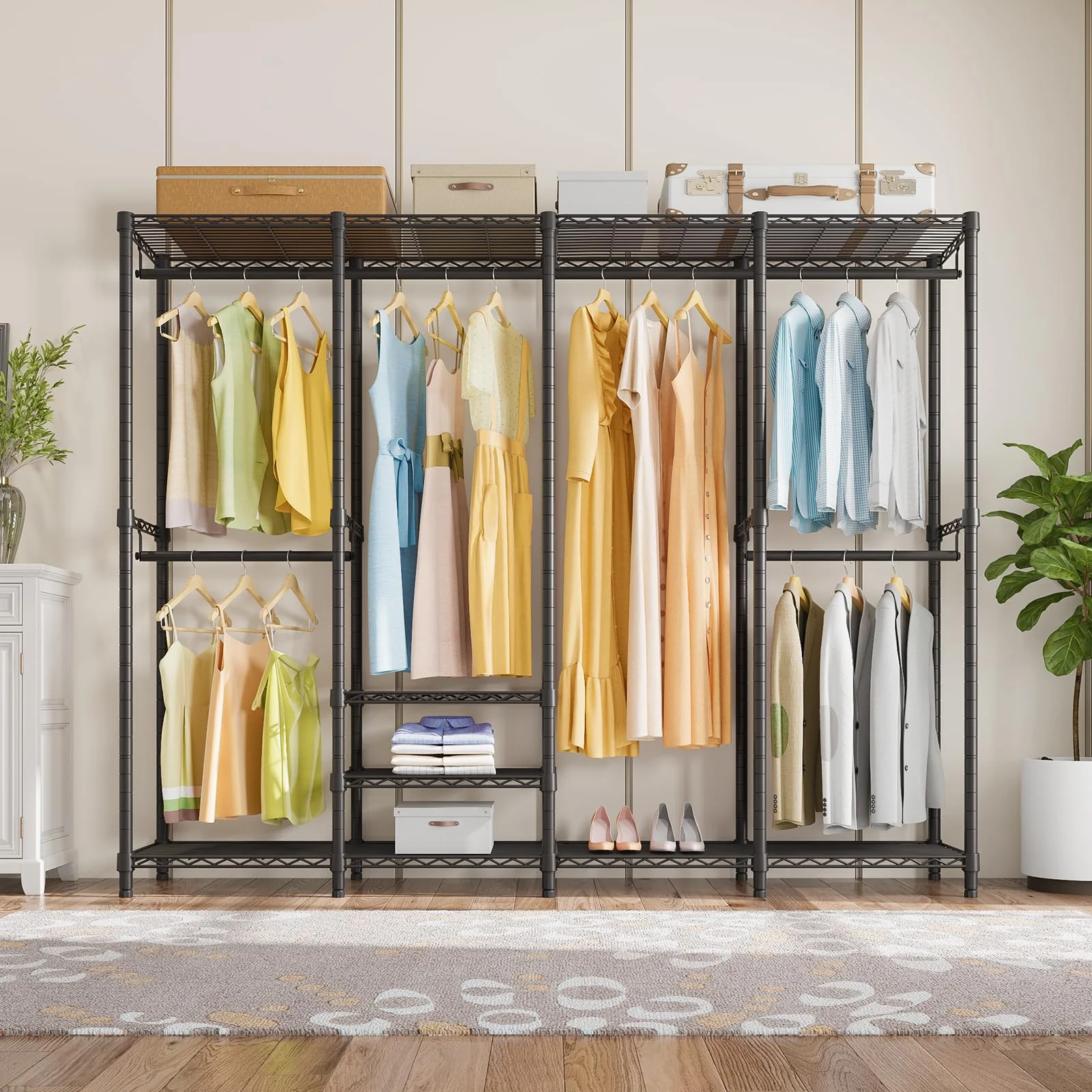 - All-in-one Multifunction Closet Rack: 4 Tiers Extra Large Garment Rack V40 offers you various storage area to place your clothes. accessories. shoes. etc. It features 6 height adjustable shelves for extra storage capacity. 4 detachable hanging bars that easily accommodates to the length and size of your garments.