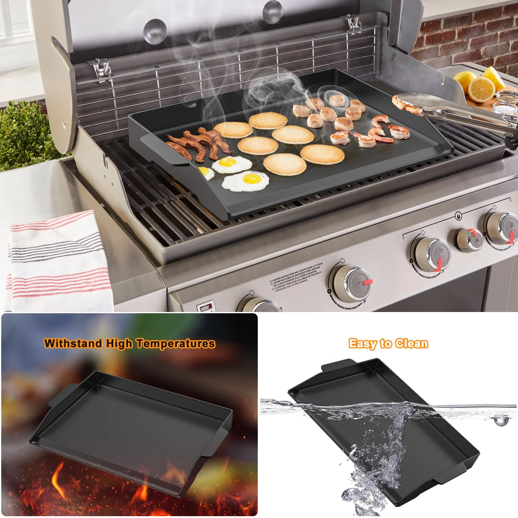 - Dimension: 23 L×16 W×2.6 H. fit virtually any grill and 4 burner range oven and turn your grill into an outdoor kitchen for all-around cooking. it's the perfect outdoor cooker. you can cook pancakes. bacon. sandwich. eggs. salmon. grilled cheese. and chicken. burgers. sausages. vegetables. and so on.