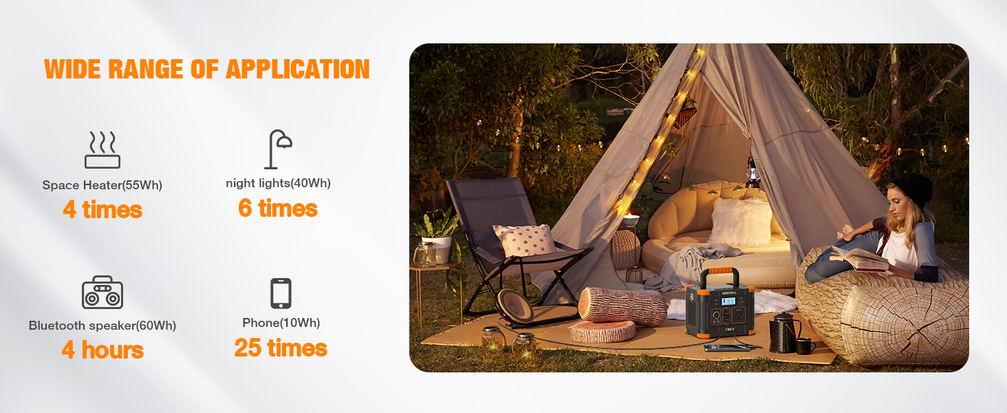 - ��288Wh Capacity. 330W Output��330W (600W surge) pure sine wave supports most laptops. tablets. phones. lights. fans. CPAP medical devices. projectors. TV. mini-refrigerator. speaker. camera (rated power less than 330W). 288Wh huge capacity but light weight makes it compact and perfect for camping. car trips and other family outings.