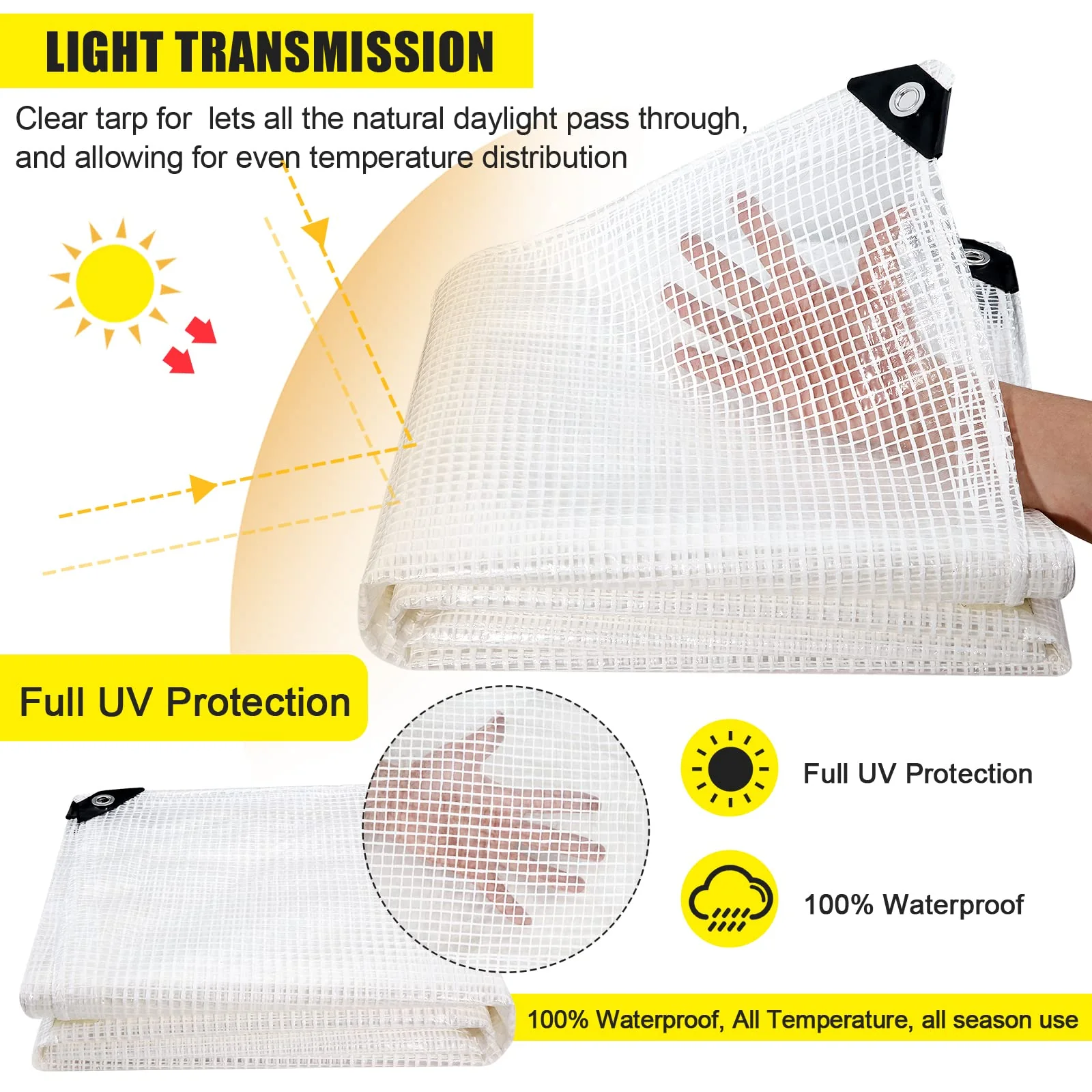 - ��LIGHT TRANSMISSION��-Our 14 mil clear tarp for lets all the natural daylight pass through.and allowing for even temperature distribution.Aluminum grommets every 35 inches eyelets allow this tarp to be tied down and secured simply