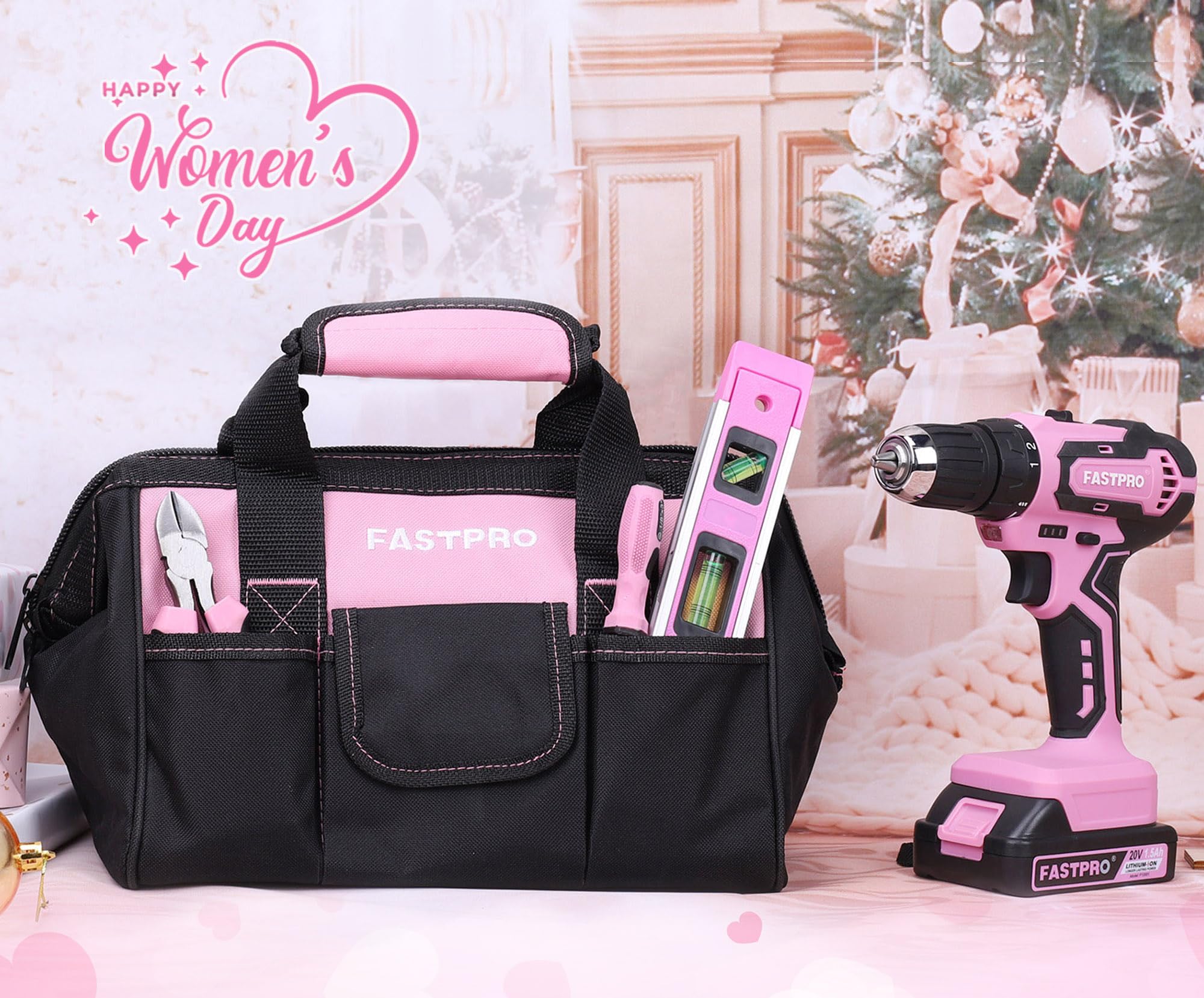 • Includes cordless drill driver.slip joint pliers. groove joint pliers. adjustable wrench. long nose pliers. magnetic screwdriver holder. screwdriver bits. utility knife. tape measure.The pink drill set for women is perfect for your home use or gifts