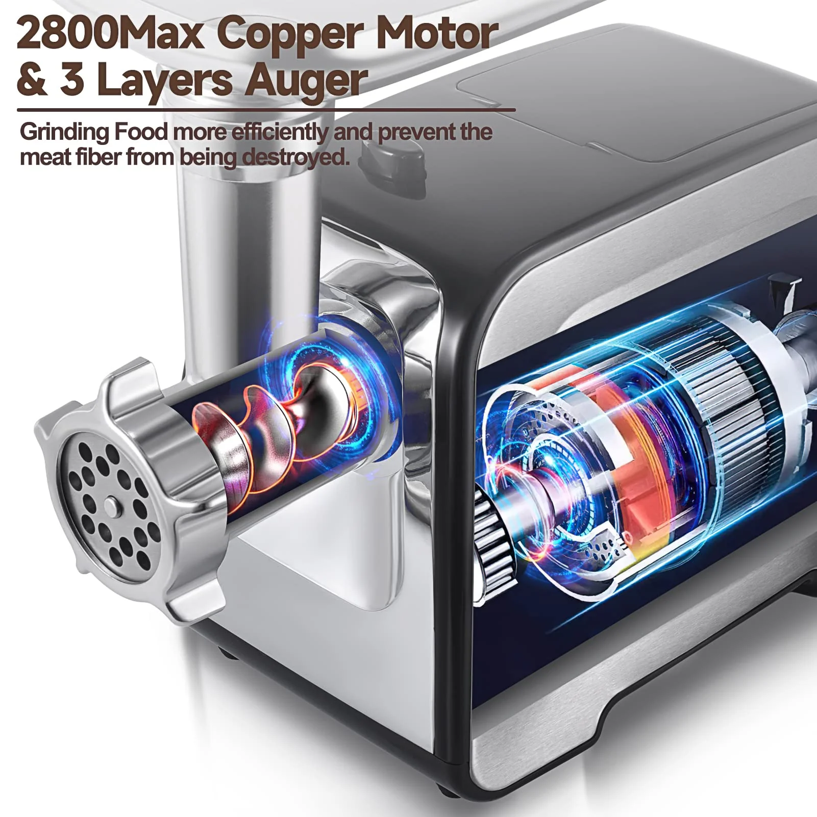- POWERFUL ELECTRIC MEAT GRINDER: 110 Volts - 60 Hz. suitable for North Americans. Features 350W rated power and 2800W max locked power. Grinds up to 3 lbs of meat/minute. fast and convenient. 100% copper motor and mental gear are more durable. you can use it over and over again.