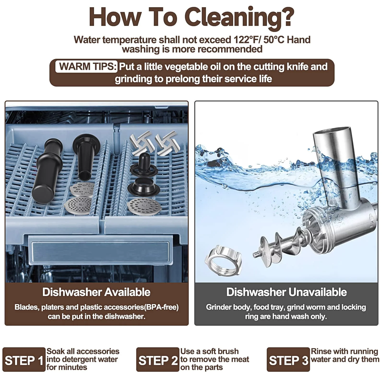 - EASY TO CLEAN: All parts of the meat mincer are easy to detachable for cleaning. We recommend washing by hand and wiping with a cloth. because some aluminum alloy parts will be oxidized and turned dark by the dishwasher. Stainless steel blades and plates are safe for dishwashers.