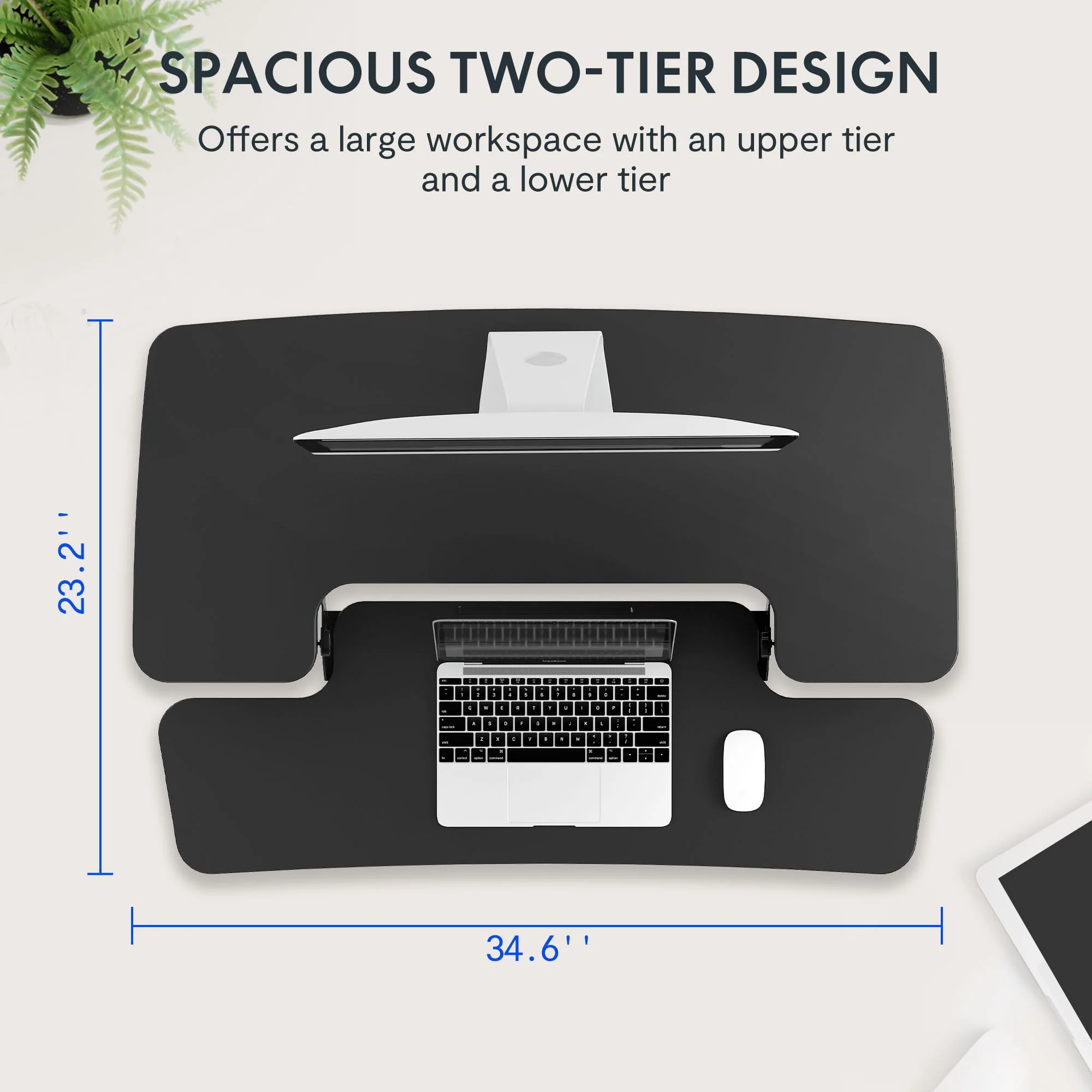 - Ergonomic 2-Tier Design: Our 2-tier design offers ergonomic excellence for reading and typing! The 35'' width of top tier holds a monitor up to 27'' with ease. the roomy base tier of 12.1'' depth holds a standard keyboard and mouse or a 13'' laptop