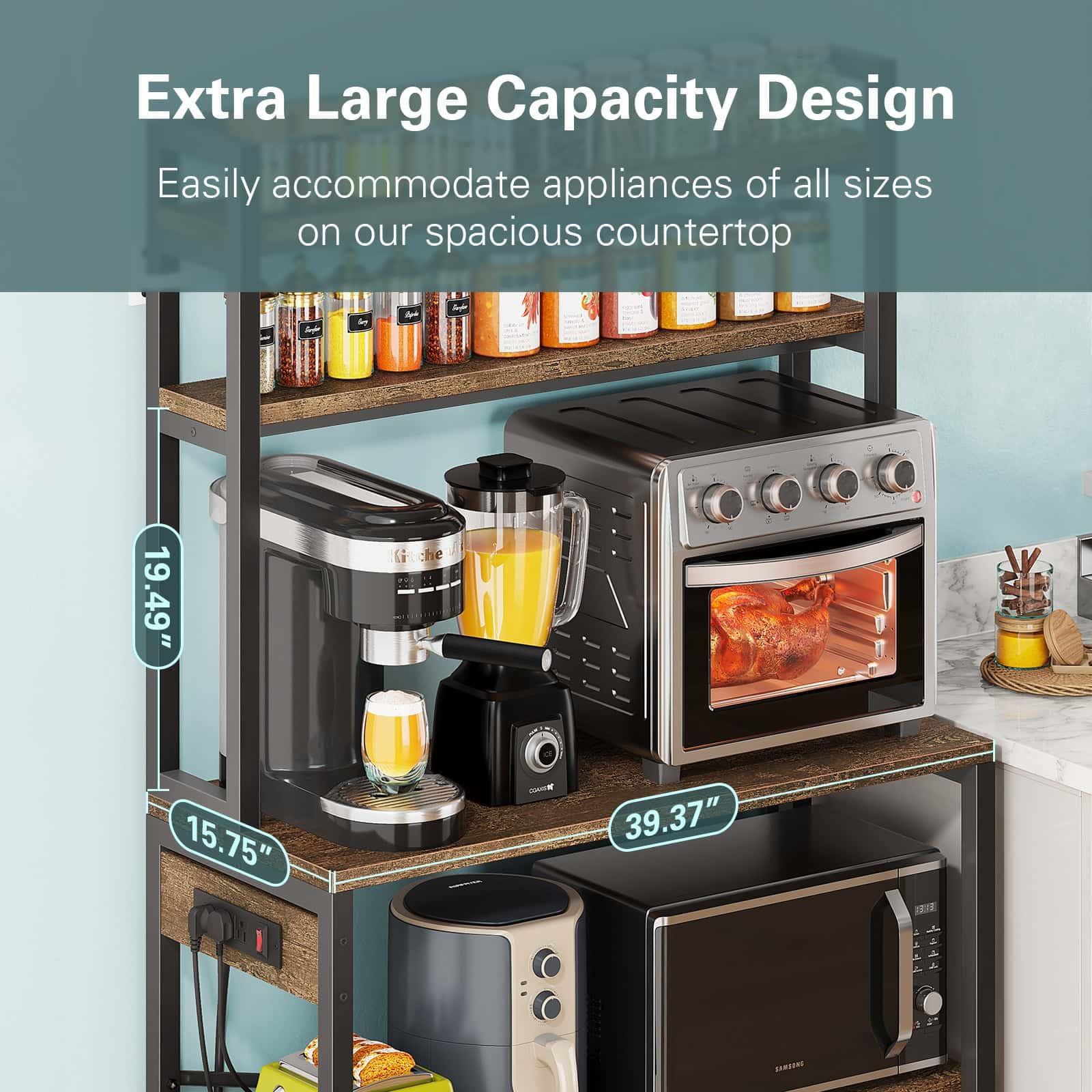- ��Space Maximization��: The size of large bakers rack is 39.4��15.7��66.9 inch. The 39.4 inch width can enough store your microwave+coffee machine+juicer and 5-tier coffee stand design to store toaster. fryer. sauce bottles and any other household items. It also features a breathable grid layer at the bottom for fresh fruits and vegetables.