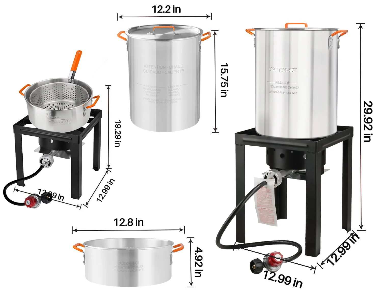 - ?????? ?????? ??????????????: Turkey Fryer—The large steamer compartment has been upgraded from 15 quarts to 30 quarts. greatly increasing the cooking capacity. Use a stove with a high-temperature coating to prevent blistering. odors and rust. Both pots are equipped with orange rubber heat-resistant handles to effectively prevent burns and prevent slipping. High-output 5500BTU burner and CSA-certified high-pressure regulator for safe. fast food cooking.