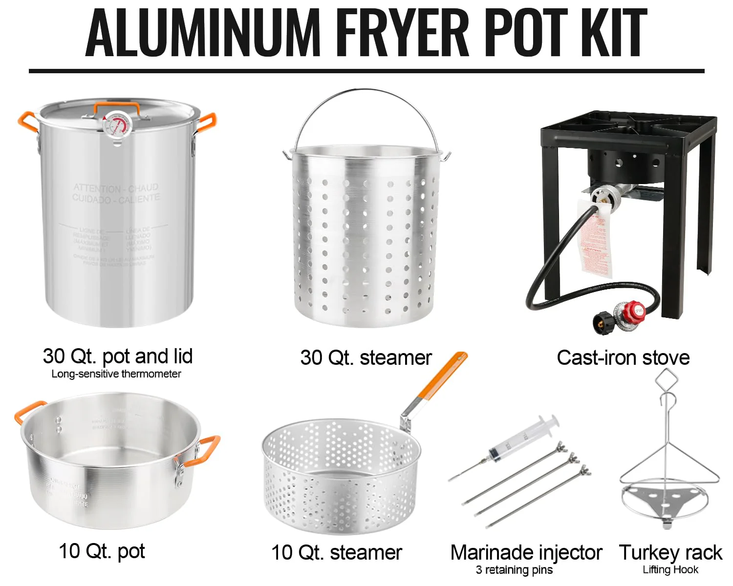- ???????????????? ??????????????????????: The package features a heavy-duty propane square stove burner with a coated steel frame. It includes 30-qt and 10-qt aluminum fryers & baskets with lids. a turkey rack with 3 stainless steel retaining pins. an anti-scald hook. a 1oz marinade syringe. a 12 extra-long probe thermometer. and a 5 PSI CSA certified regulator with a 38 hose. These accessories enhance your outdoor cooking experience. making it even more enjoyable for family and friends.