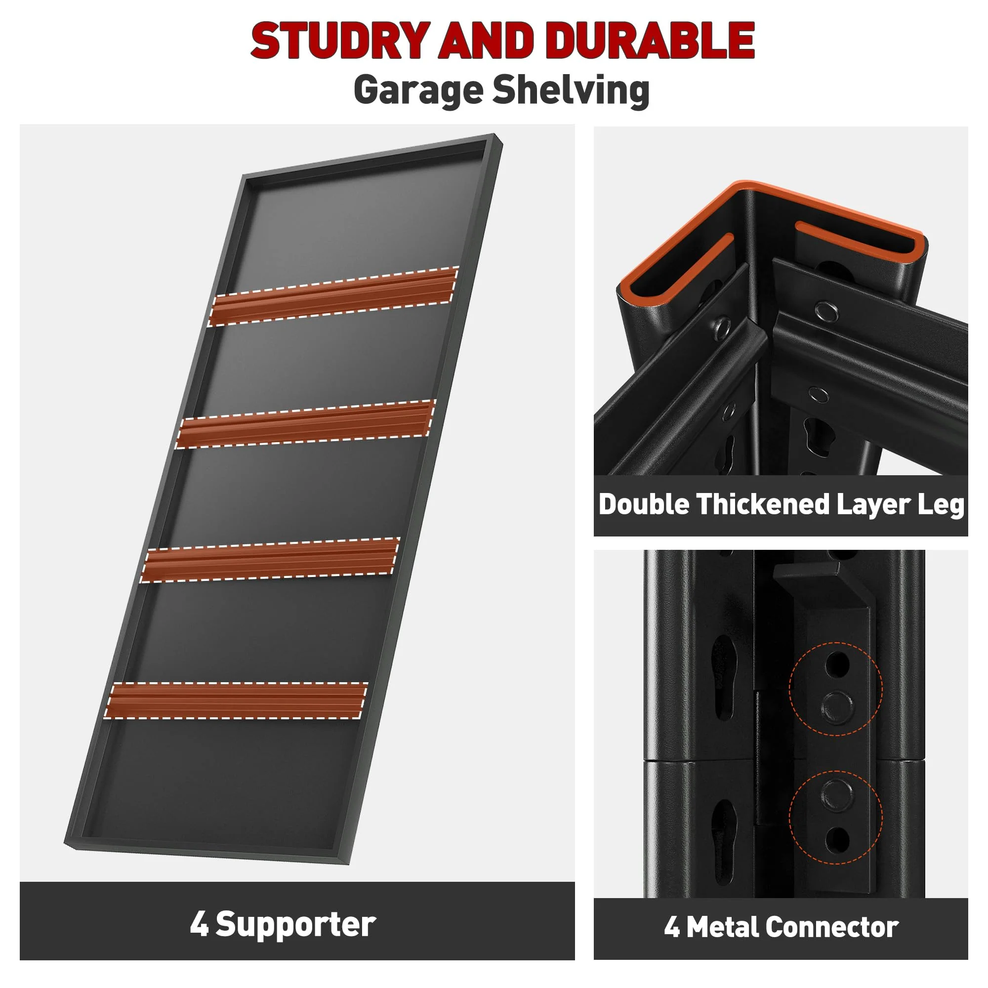 - ��Sturdy & Durable & Rust-Proof Heavy Duty Shelving�� All metal structure �� 2-layers metal leg �� 4 ribs for every metal shelf rack make the industrial shelving for storage super Stable & Durable.The steel storage shelves uses an anti-rust painting tech. easy to clean. moisture-proof and rust-proof. It will not wobble or shake no matter how many stuffs(even nothing) you put on. This high quality shelving units and storage heavy duty can serve you for many years.