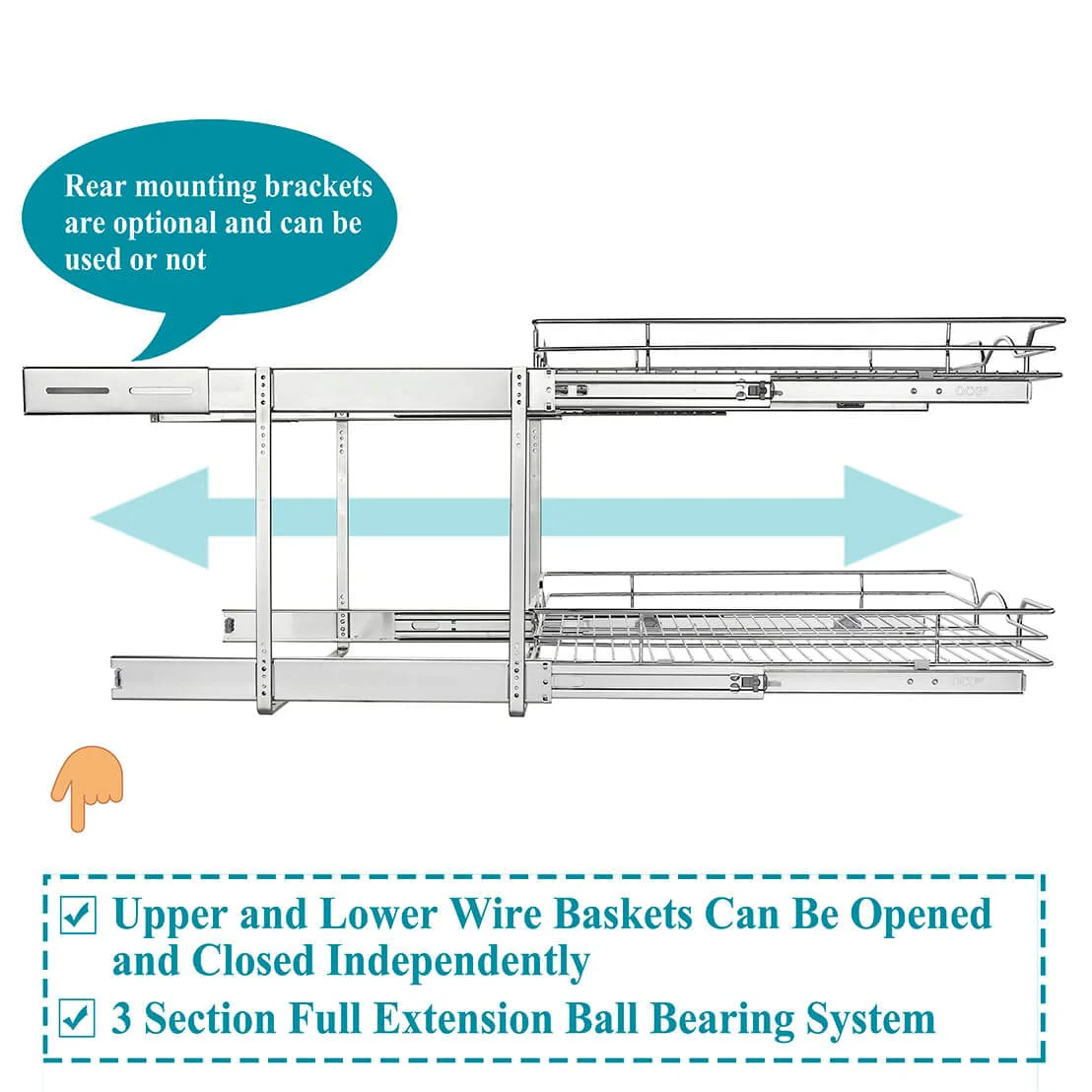 - Easy to Install: Comes with step by step installation manual .mounting template and all the hardware necessary for a quick. easy install. Both upper and lower wire baskets slide out independently on precision ball bearing slides so you can reach to your items easily and more quickly.