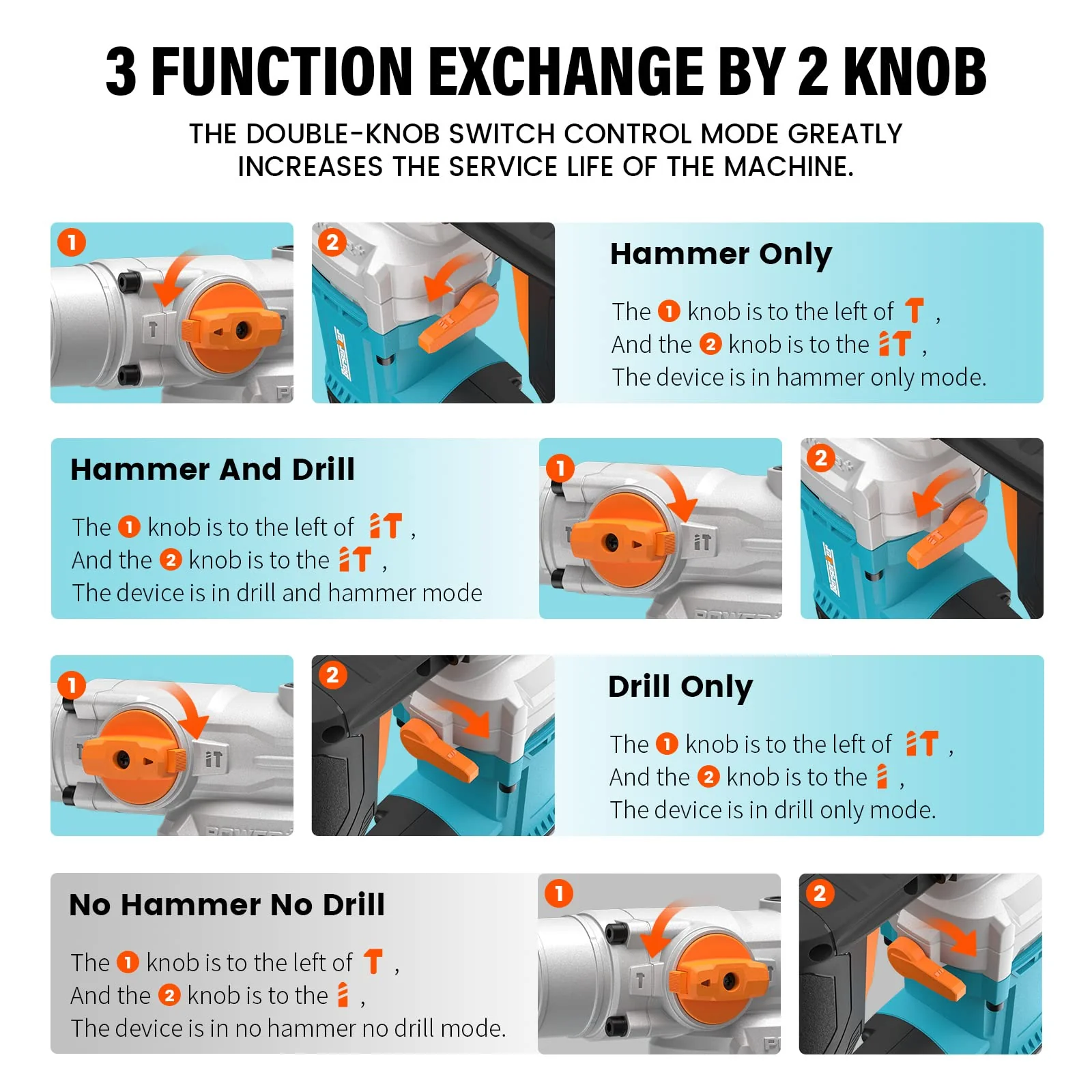 - ��Easy to operate��You can quickly switch the 3 specific mode operation for Rotation Only. Hammering with Rotation . Hammering Only by two different switches for multiple applications. Compared with single function switch design. double function switch design can extend the service life.
