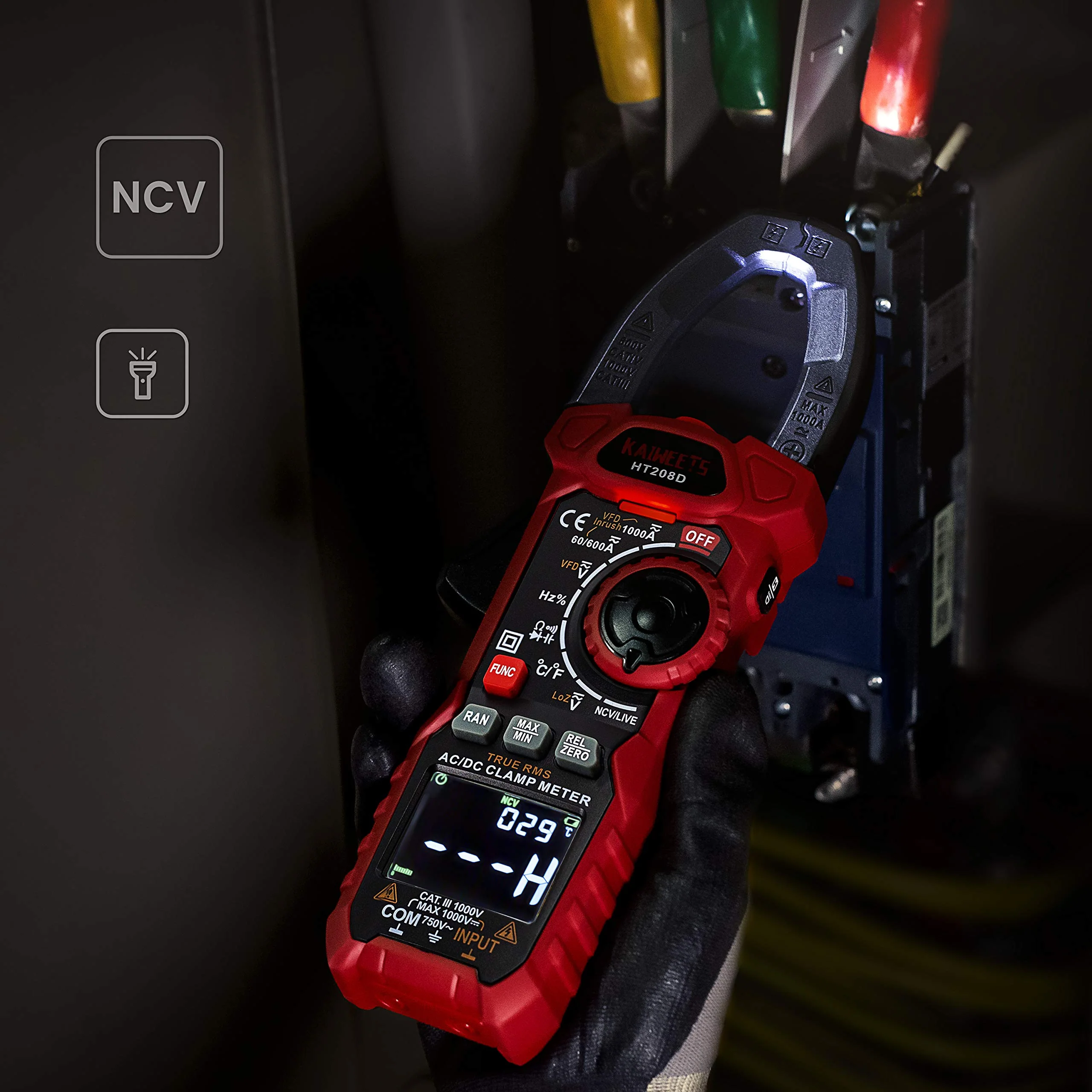- NCV Detection & LED Flashlight: Built-in Non-Contact Voltage (NCV) Detector can easily and quickly determine whether there is a voltage. A convenient LED flashlight illuminates a dimly lit area.