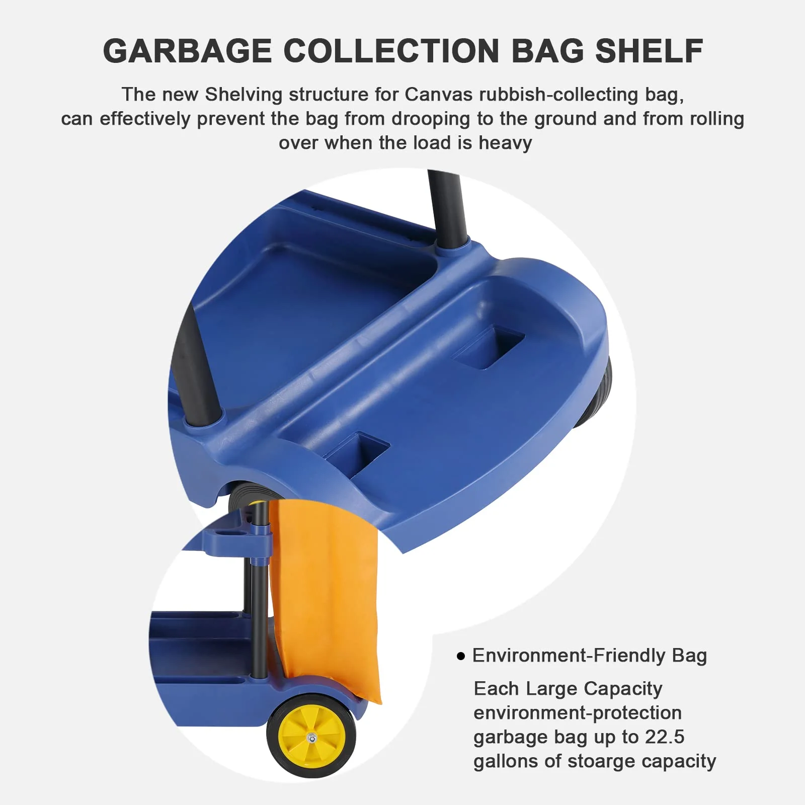 - 22.5 GALLON lARGE CAPACITY COLLECTING BAG- Equipped with a 22.5-Gallon bag .Yellow Vinyl Bag and Cover. Capacity Waste Collection Bag and Garbage Lid that Prevents Odors Escaping