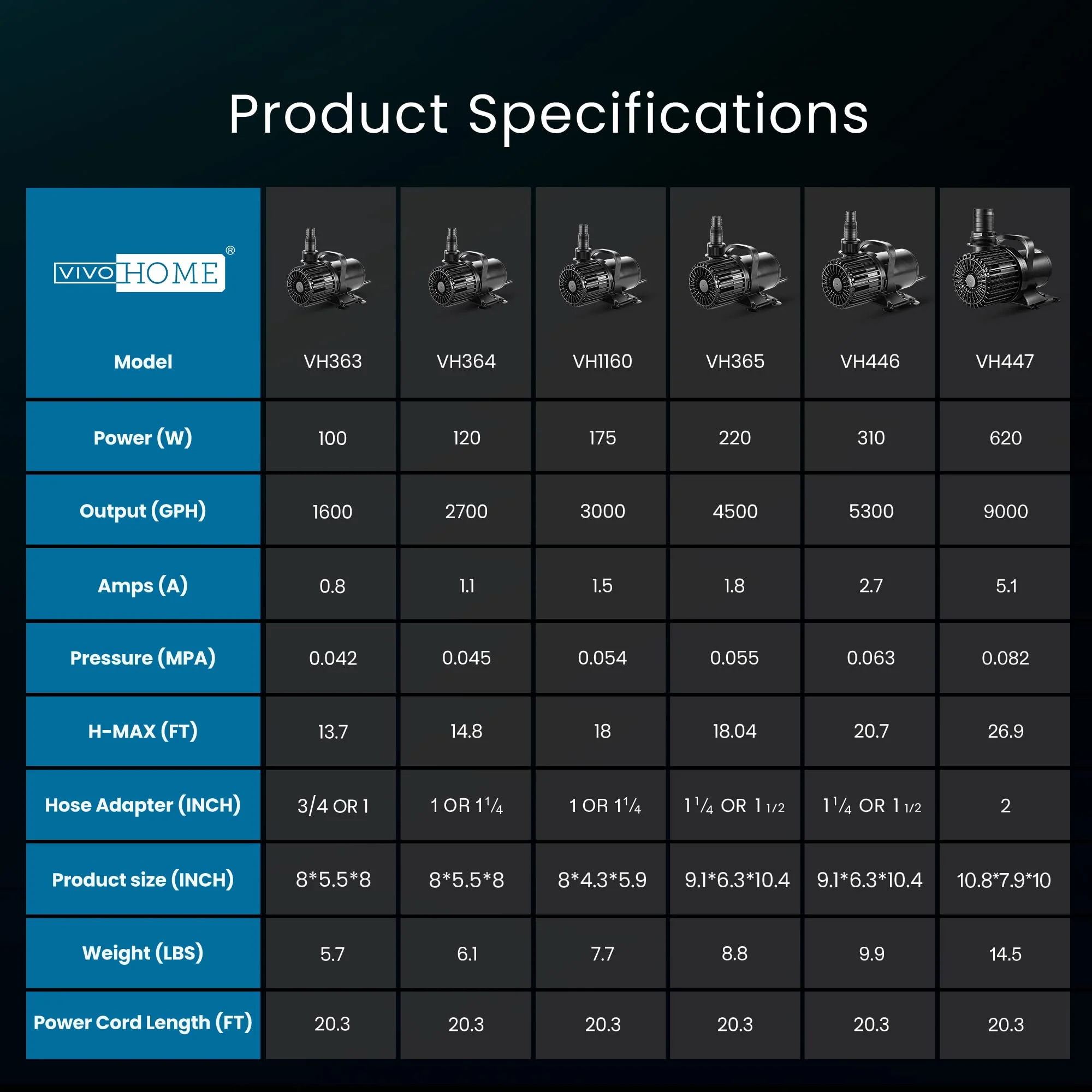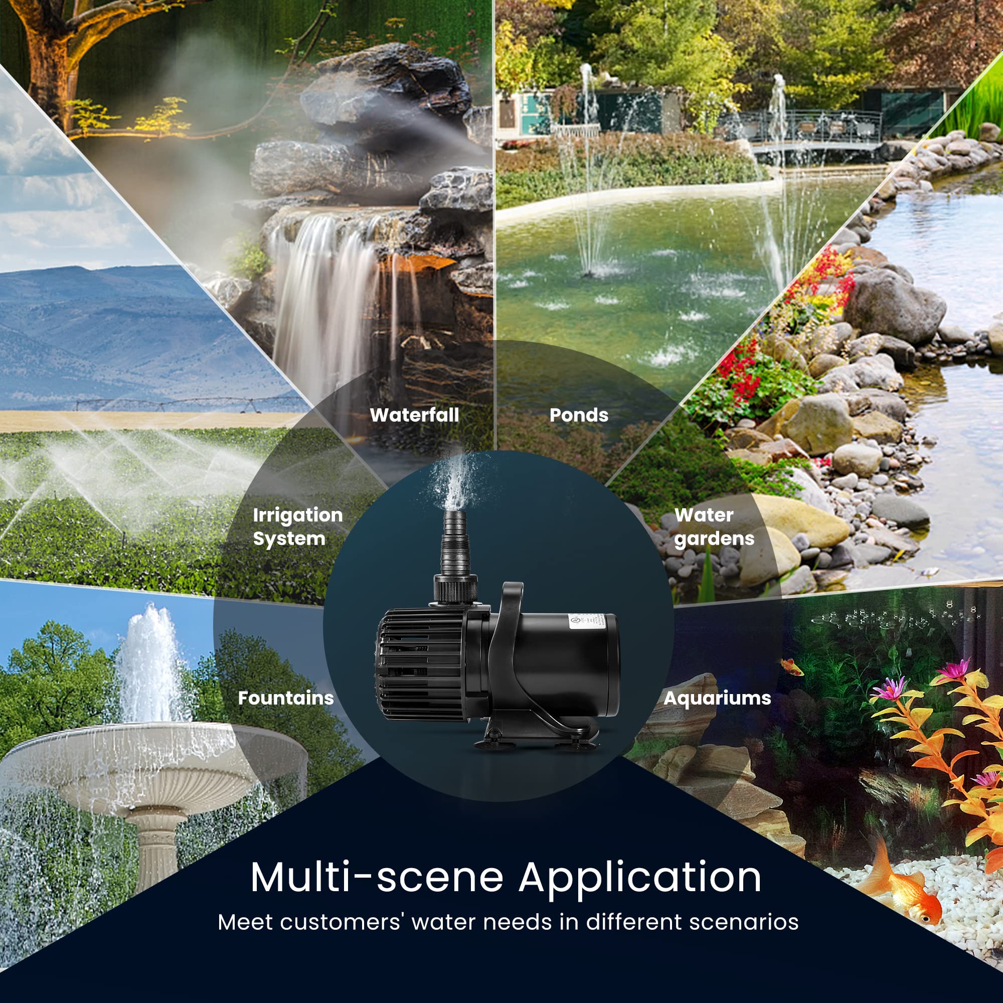 - PROFESSIONAL PUMP - VIVOHOME high-pressure water pump equipped with hefty impellers could bring great powerful water flow with a low power consumption; It is designed for multiple applications including koi/fish ponds. water gardens. fountains. aquariums. waterfalls. statuary hydroponic. irrigation systems and water features; It can function properly when submerged underwater and also can be used terrestrially. but long-time terrestrial use is NOT recommended