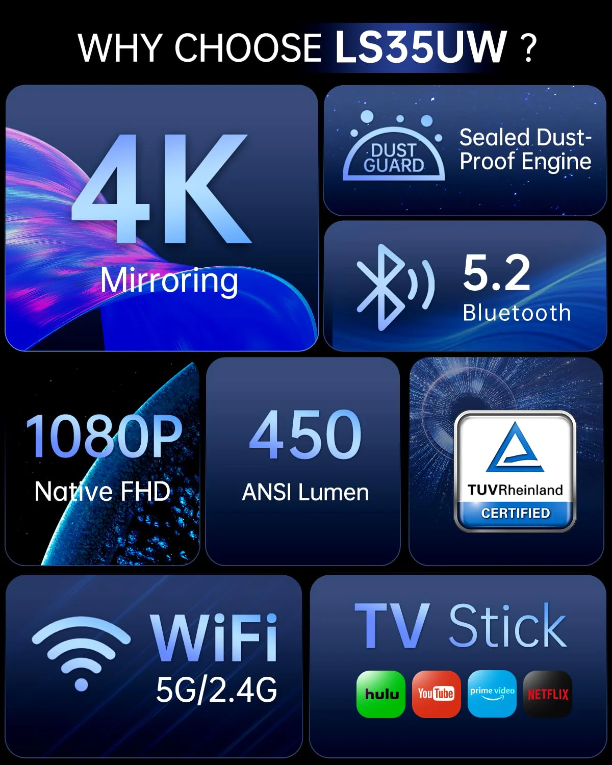 - ��FASTER & STABLE 5G/2.4G DUAL-BAND WIFI & BLUETOOTH 5.2 CONNECTION�� Enjoy fast and stable connections with the dual-band 5G/2.4G WiFi and Bluetooth capabilities of our projector. Whether you're streaming content. playing games. or connecting external devices. you can count on seamless performance without any buffering or lagging issues.
