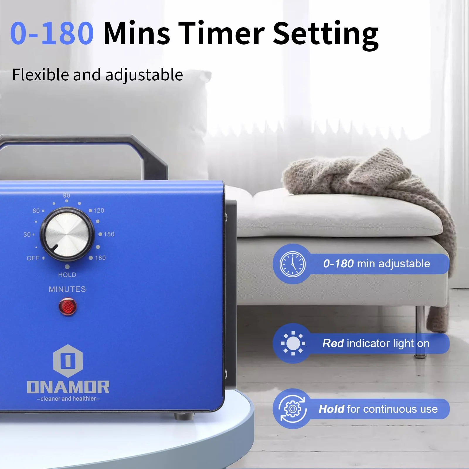 - ��Easy To Use��- You just need to turn the timer to work. the timer can be set for up to 180 minutes. and the HOLD setting can also be used continuously. We suggest that to set a time before you leave the room and ensure that no people (or pets) is in the room when it is working. It can start from 10 minutes and increase the setup time if necessary. depending on the size of the space.