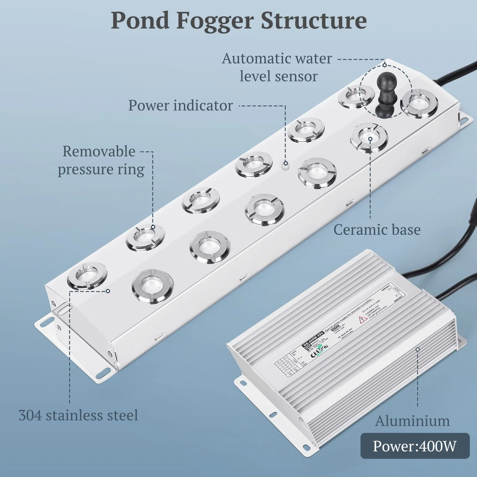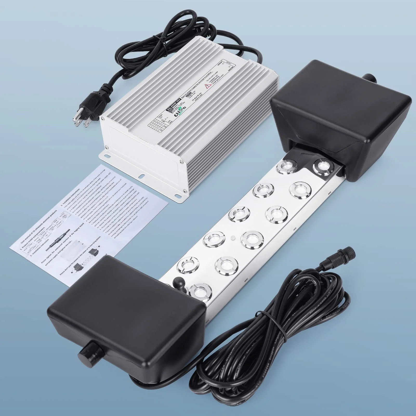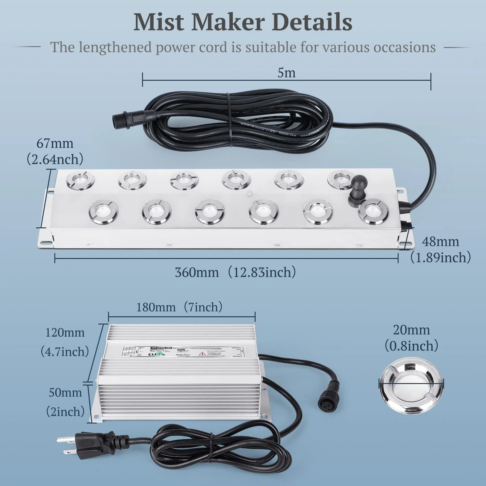 - PROFESSIONAL IP67 WATERPROOF - The Fog maker is made of food-grade 304 stainless steel. and featured high strength. resistance. and good durability. An IP67 waterproof power supply is provided. and it can work in a damp and dusty environment. Please do not put the power supply directly in the water. The 5m power adapter cable is long enough for various applications. The service life of each disc is usually 3000-5000 hours