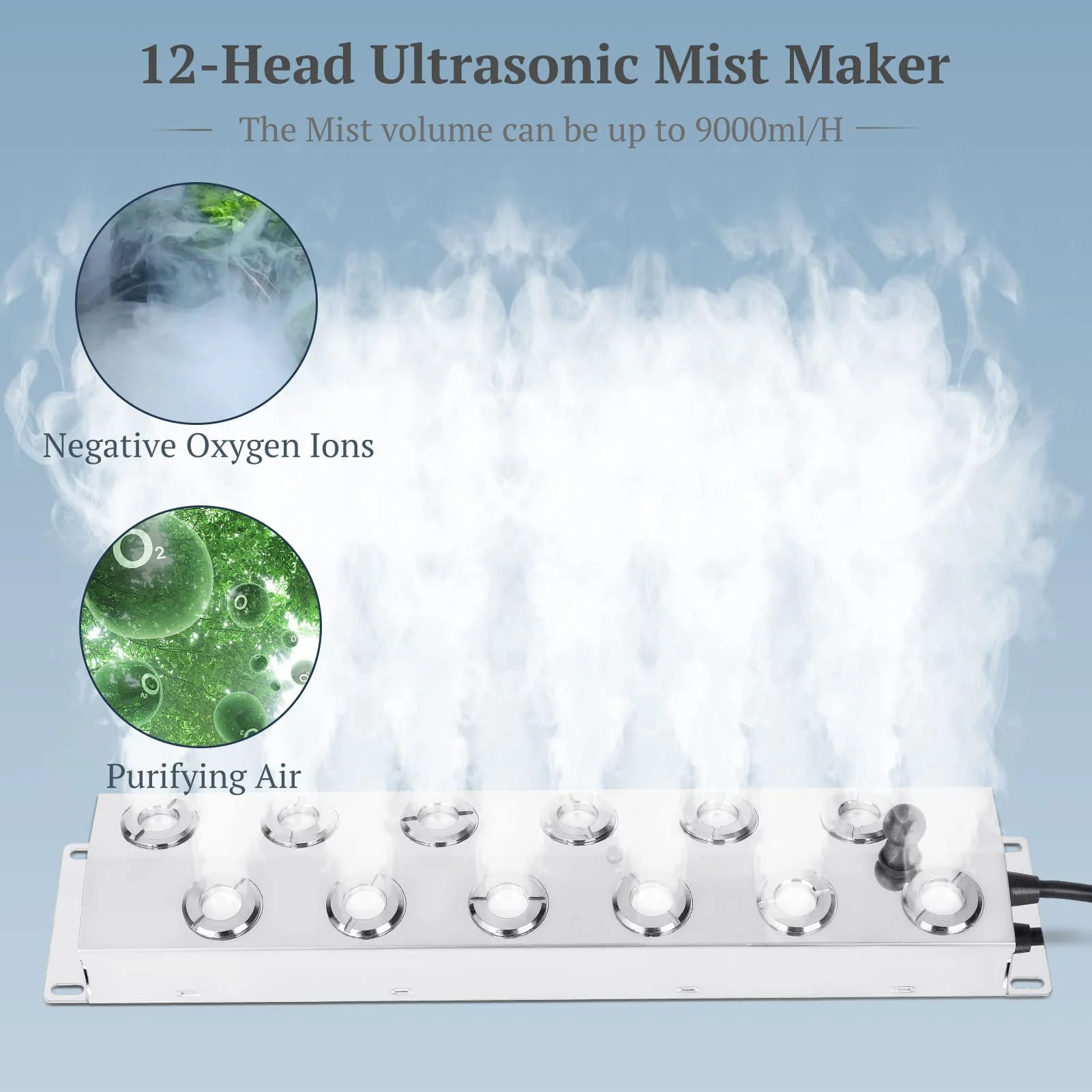 - 12-HEAD MIST MAKER - The 110V 400W high-efficiency ultrasonic mist maker brings a huge amount of mist to create a magical atmosphere. The output fog of the ultrasonic mister can reach 9000ml/H. which can cover at least 9 square meters indoors and 7 square meters outdoors. The humidifier fog machine will release a large of negative ions. which help to freshen the air and the mist will add humidity to a room. Note: It's recommended to power off the machine after a maximum of 8 hours of continuous