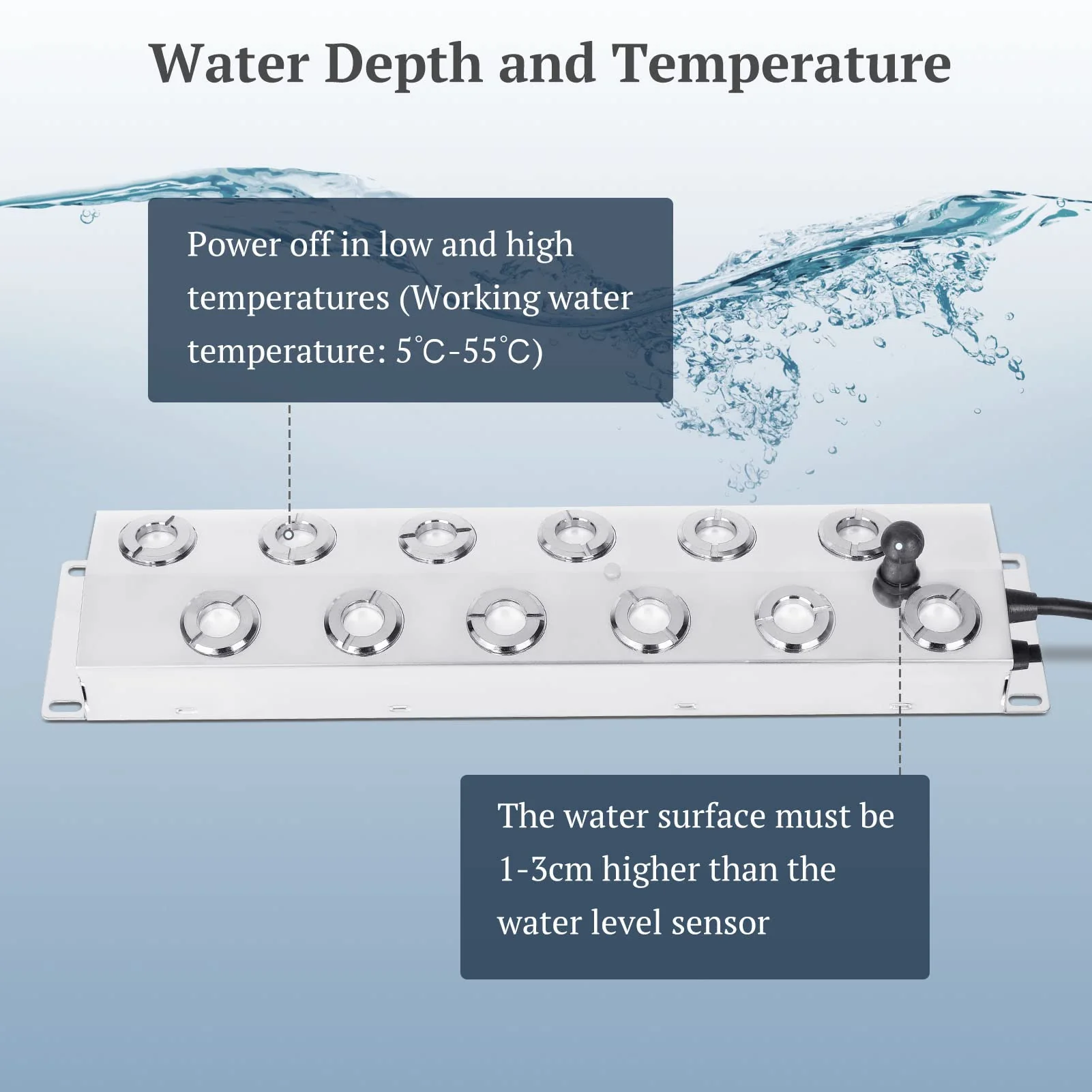 - BUOY & PROTECTION FUNCTION - The Pond Mister Fogger comes with a pair of buoys. which keep the machine at a proper water level. In addition. the ultrasonic atomizer has water shortage protection and high-temperature protection. If the water surface is below the water level sensor or the temperature is above 55�� (the working water temperature range: 5��-55��). the power will be automatically shut down