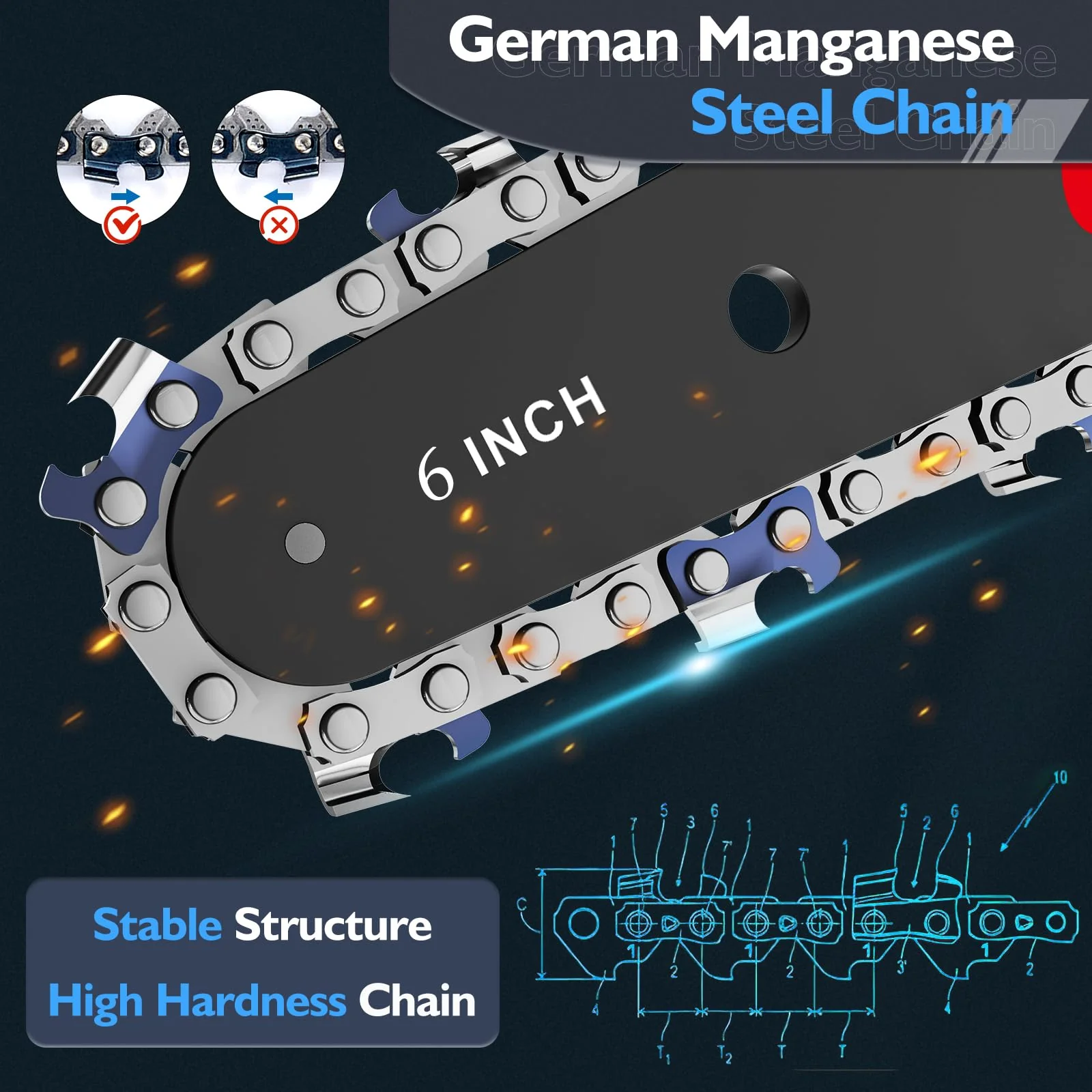 - 5 SECURITY DESIGNS: 1. Security lock prevents accidental activation (The security lock & start button need to be pressed simultaneously for the chainsaw to start); 2. Safety baffles to prevent the wood from splashing; 3. Equip with anti-cut gloves that protect your hands; 4. Equip with an anti-slip texture handle. making you grip the mini chainsaw tightly; 5. Equip with goggles to protect your eyes from sawdust. With us. your safety is never second-guessed.