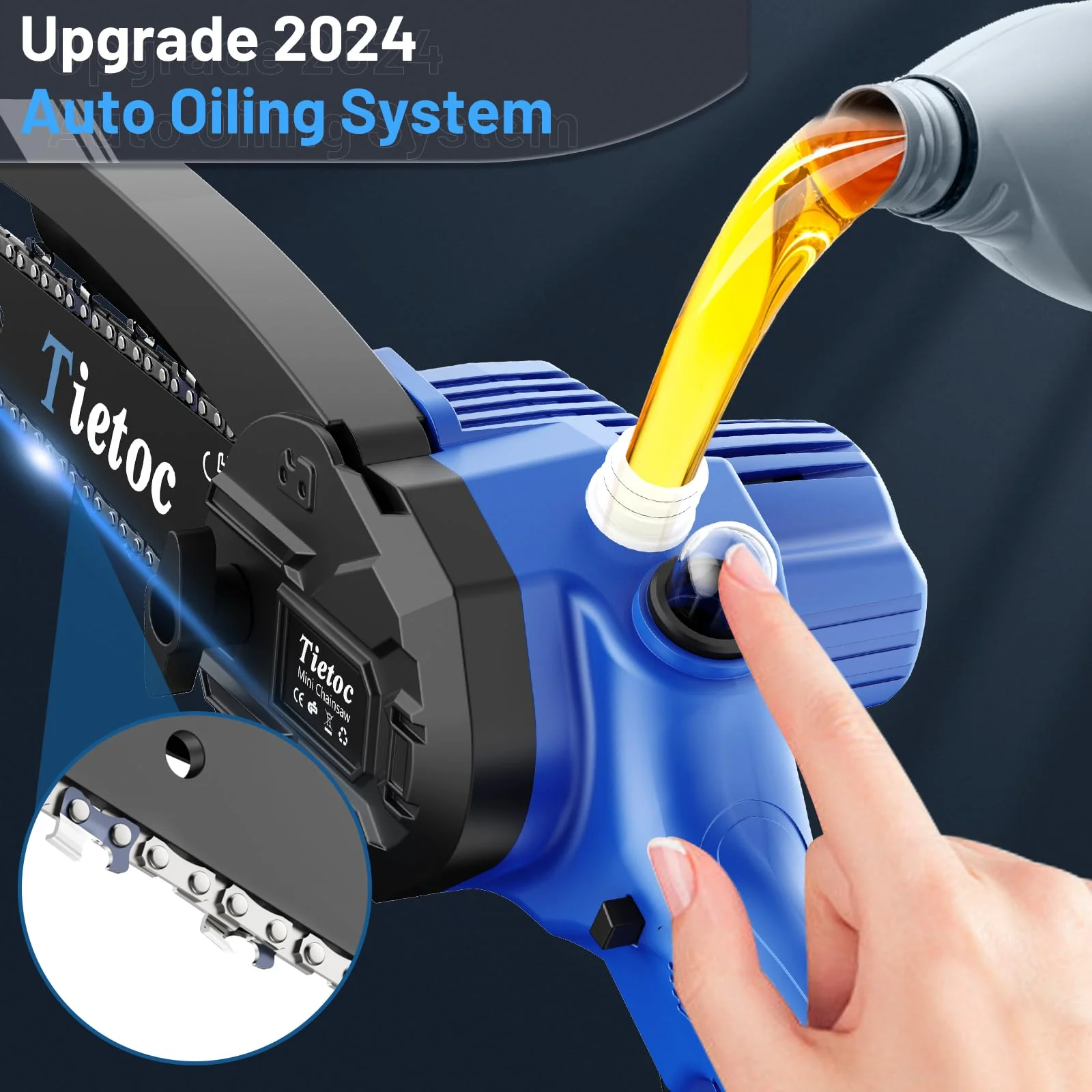 - THE AUTOMATIC OILER IS A GAME CHANGER: The saw has a reservoir for chain oil which is great. (Some Other Mini Chainsaws Do Not Have That!) Automatic oiling isn't self oiling like a larger saw. but a bulb you push to feed oil to the bar and chain. All of these mini saw blades require lubrication to work at their best so you should press the lubrication button fairly often while cutting. (Universal Saw Chain Oil for Fast Efficient Cutting Is Recommended.)