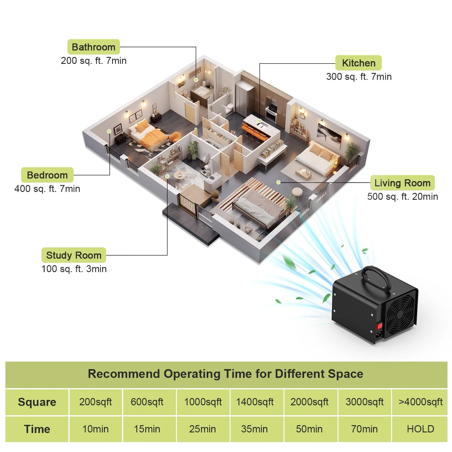 - Maximum output of 30.000 mg/h is suitable for spaces up to 4.000 sq ft.