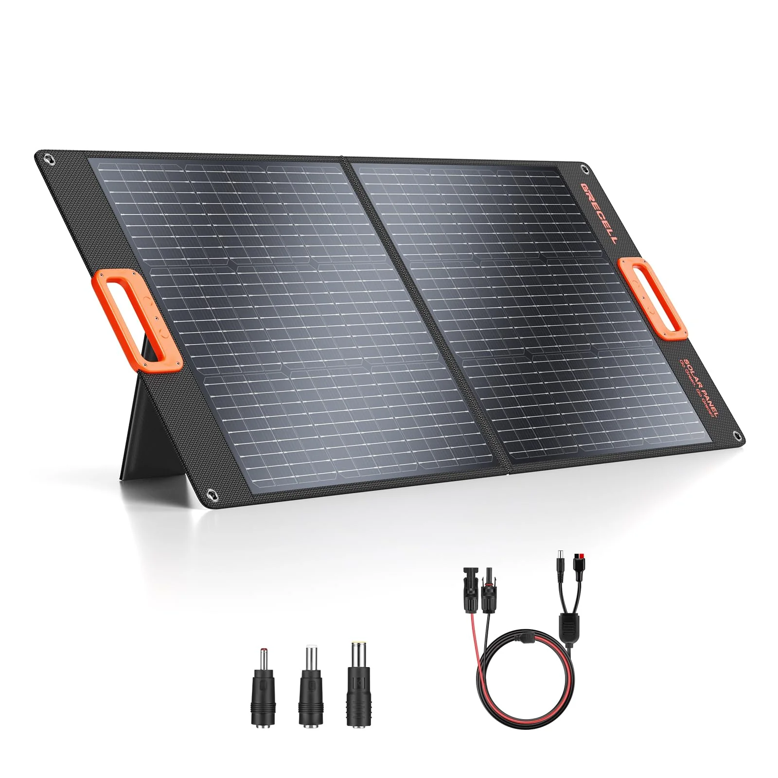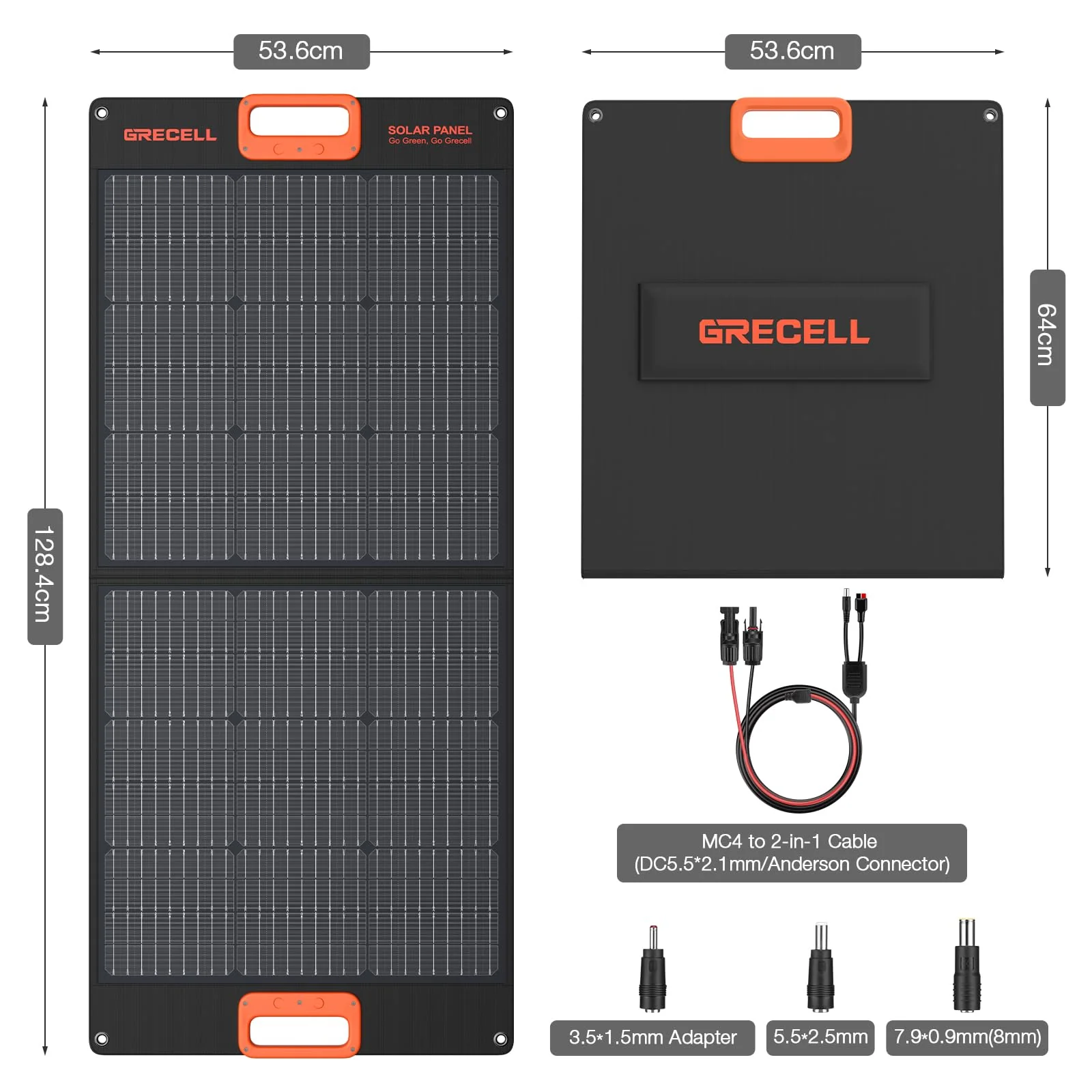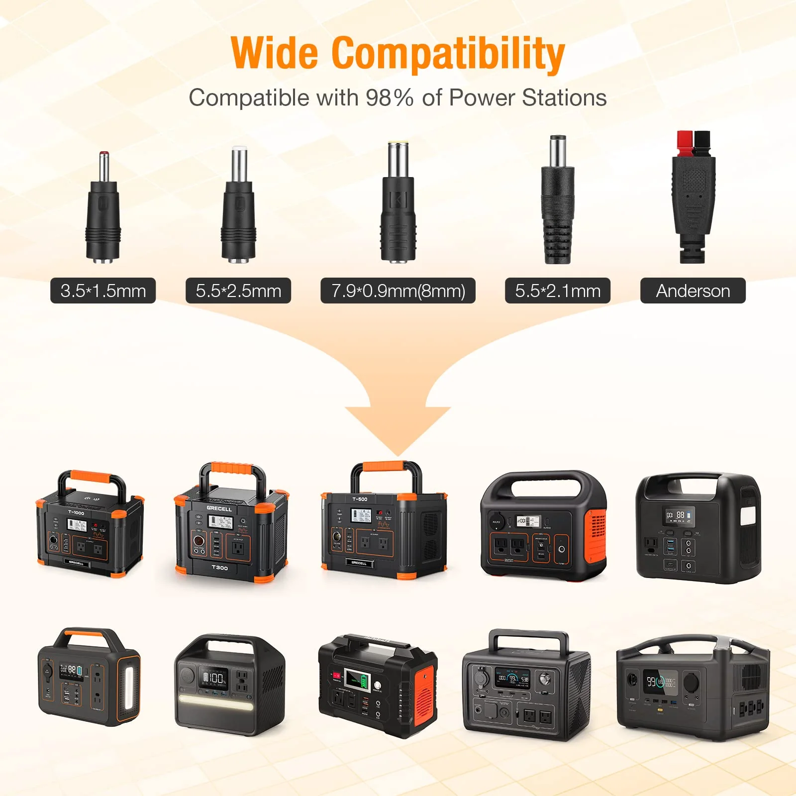 - MADE FOR SOLAR GENERATOR--GRECELL 100W solar panel comes with an MC-4 connector (can deliver 25A(max)current). 8mm/5.5*2.5mm/3.5*1.35mm/5.5mm*2.1mm DC adapter/MC-4 to Anderson Cable. compatible with most solar generators/portable power stations on the market (Jackery. Ecoflow. Bluetti. Paxcess. Suaoki. Flashfish portable generator. etc). Includes different sizes of connectors perfect to charge our GRECELL portable power stations as RV camping emergency power.