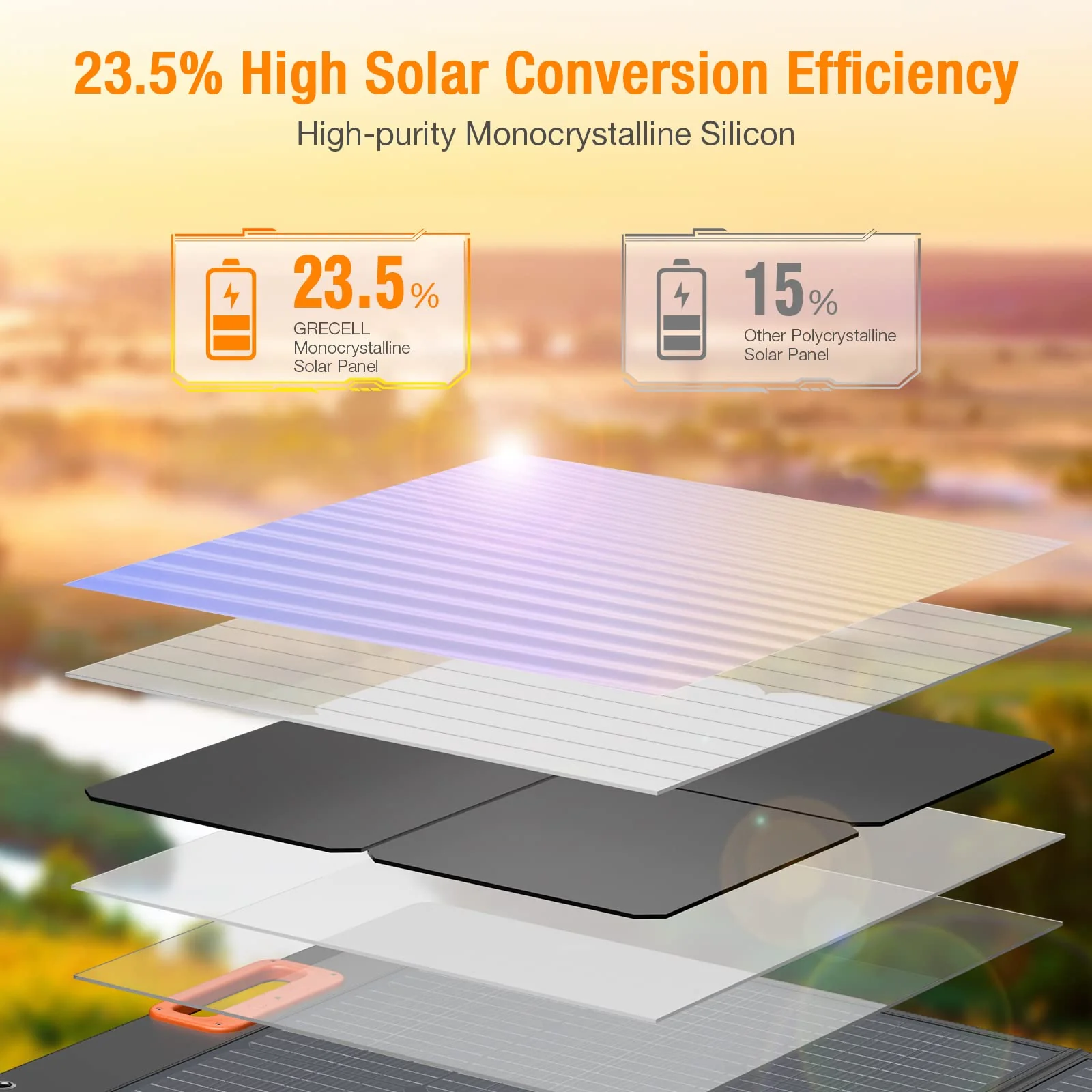 - HIGH CONVERSION EFFICIENCY--Convert sunlight into electricity using a powerful array of monocrystalline solar cells to generate up to 100W and 20V of on-the-go power. The solar cells receive the most effective sunlight. up to 23.5% efficiency. The built-in smart chip intelligently identifies your device and maximizes its charging speed while protecting your devices from overcharging and overloading. providing more energy and a longer lifecycle than conventional polycrystalline solar panels.