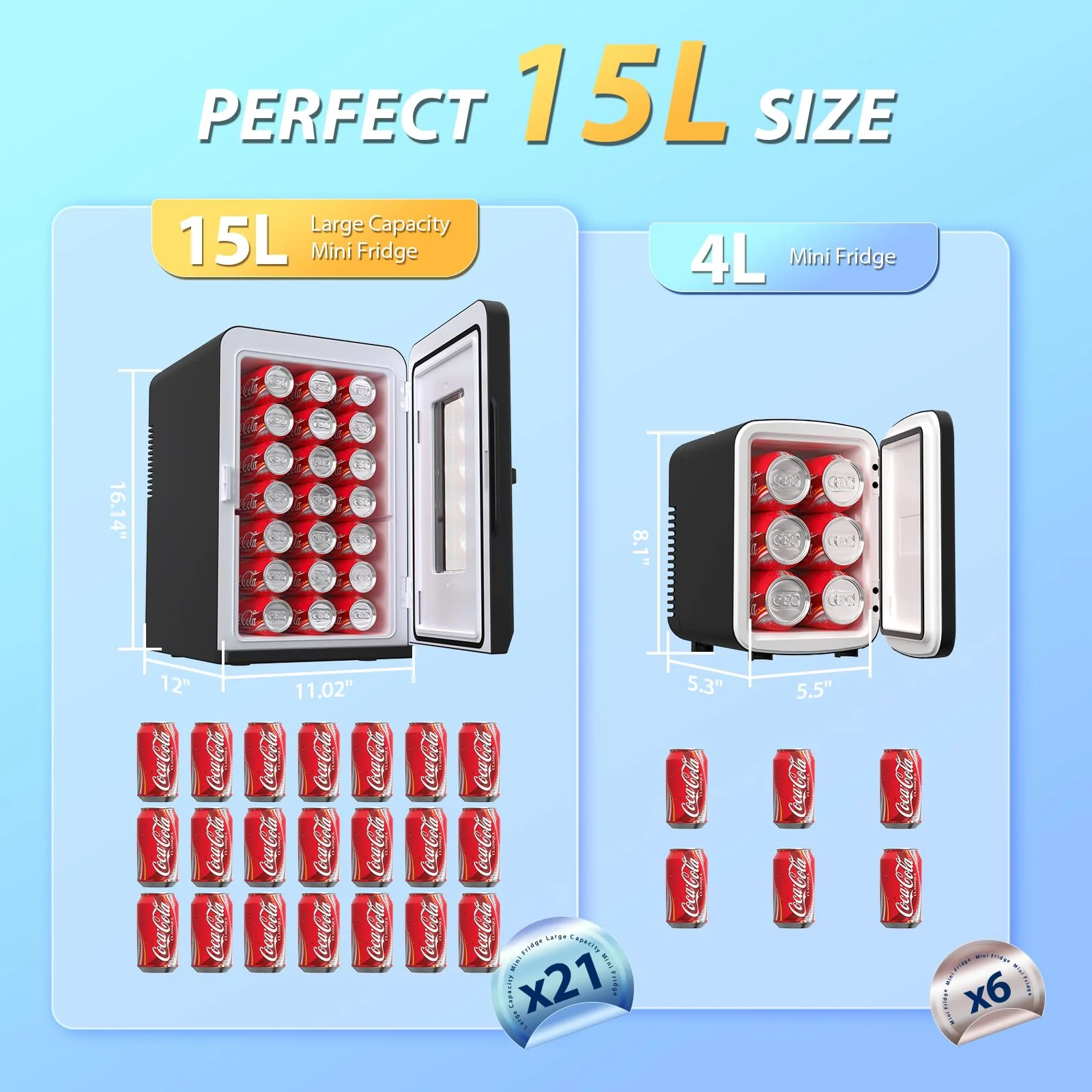 - ��15-Liter Mini Fridge��The 15L mini refrigerator can easily store 21 cans/330ml; Inner dimensions are 9.1D x 8.3W x 13.7H. This compact size is ideal to use anywhere in your bedroom. office. dorm. travel. boating. camping and so on. With portable handle for easy to carry.