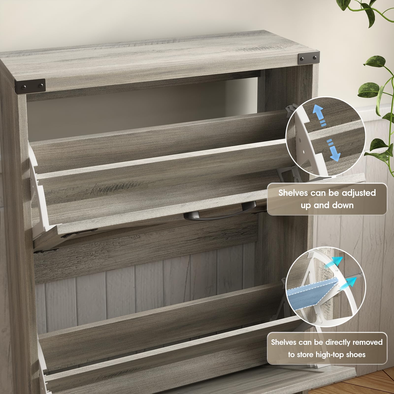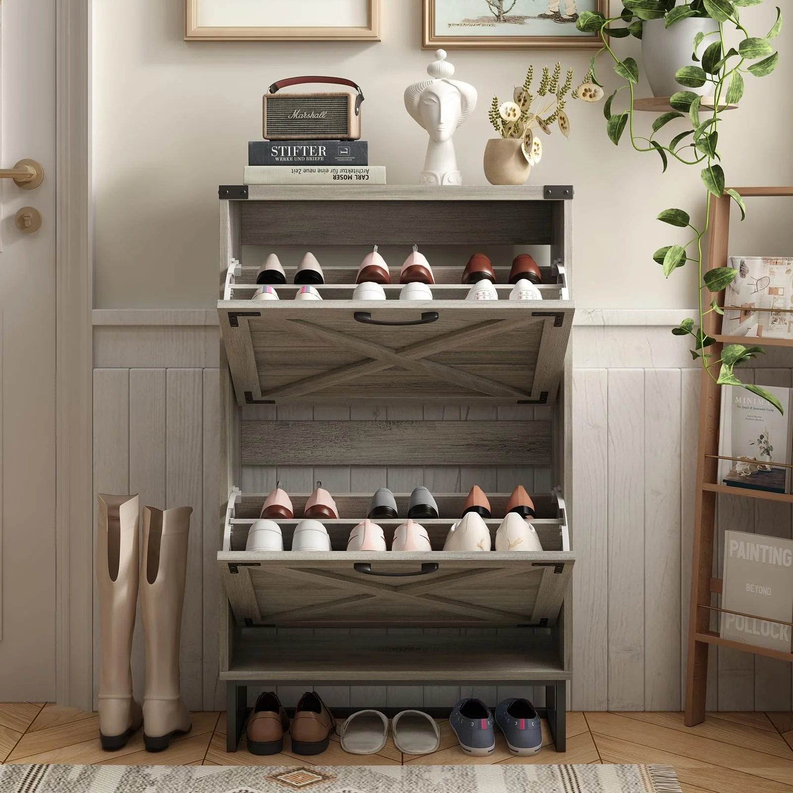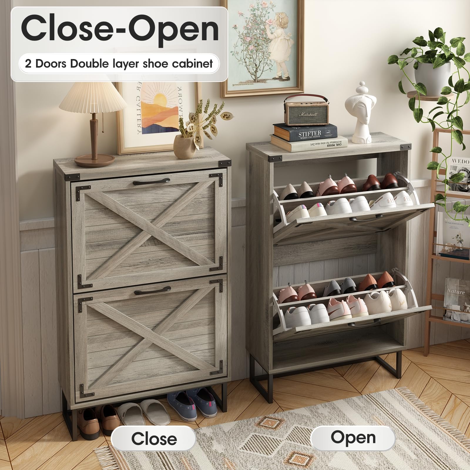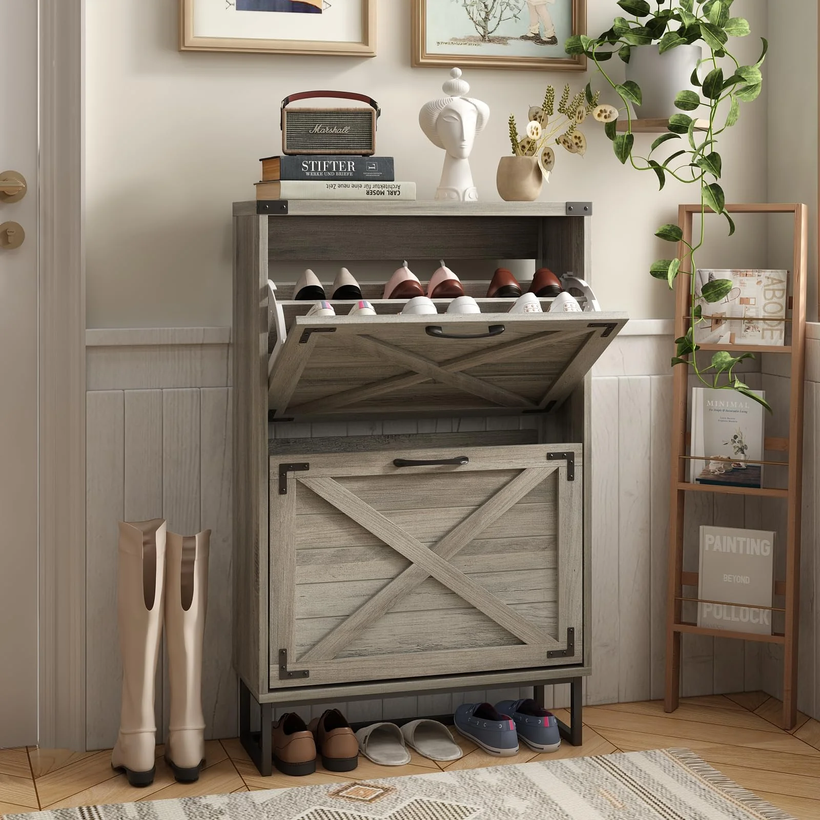 - ��Entryway Shoe Cabinet��: The hidden shoe storage cabinet with 2 flip doors. farmhouse doors with metal corner moldings and wire channel craftsmanship combine farmhouse beauty with the practicality of storage space. Perfect for placing in the entryway. hallway. living room. or porch. provides a neat looking in your home and space saving.